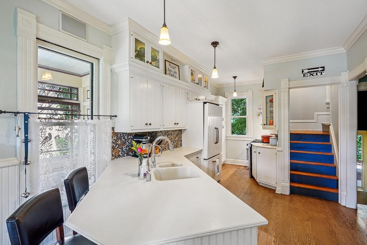 A bright and welcoming kitchen features a large white peninsula countertop with double sinks and comfortable seating, creating an ideal space for family gatherings and casual meals. High ceilings and detailed trimwork provide a touch of classic elegance, while the multi-colored mosaic backsplash adds a vibrant, artistic flair. Crisp white cabinetry, complete with glass-front upper doors, offers ample storage and a sense of openness. Large windows flood the area with natural light, and subtle pendant lighting adds warmth to the room. Hardwood flooring and easy access to adjacent stairs make this layout both functional and family-friendly.