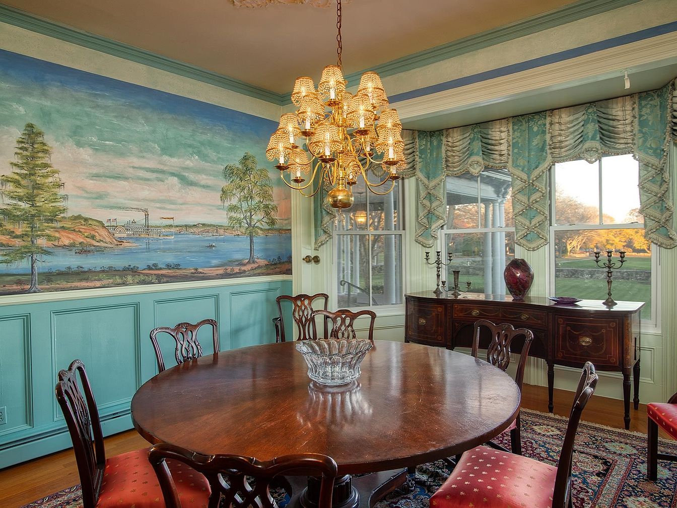 A welcoming dining room blends classic elegance with warmth, centered around a polished round wooden table surrounded by upholstered chairs in a deep red, patterned fabric. The space feels family-friendly and spacious, ideal for gatherings and meals together. One wall is adorned with a large, hand-painted mural depicting a serene riverside scene, enhancing a sense of tranquility and connection to nature. Soft blue-green paneling and trim add a historic charm, which is complemented by ornate window valances and drapes in teal and cream. A gilded chandelier and an antique sideboard complete the sophisticated yet inviting aesthetic.