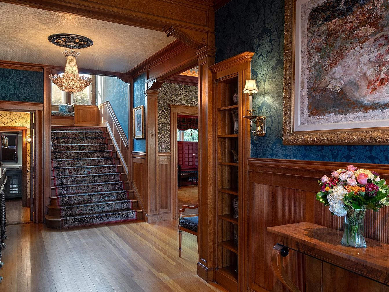 This welcoming stairway hall blends classic craftsmanship with a cozy, family-friendly atmosphere. Rich wooden paneling pairs beautifully with dark blue damask wallpaper, evoking timeless elegance. The detailed woodwork continues around the doorways and integrated shelving, ideal for displaying family treasures or organizing books. A plush, patterned stair runner enhances safety for pets and children, while a wide landing invites relaxation with sunlight streaming through large windows. A sparkling chandelier creates a warm, inviting glow, and fresh flowers atop a polished console table add a cheerful pop of color. Sophisticated artwork and vintage light fixtures complete the refined ambiance.