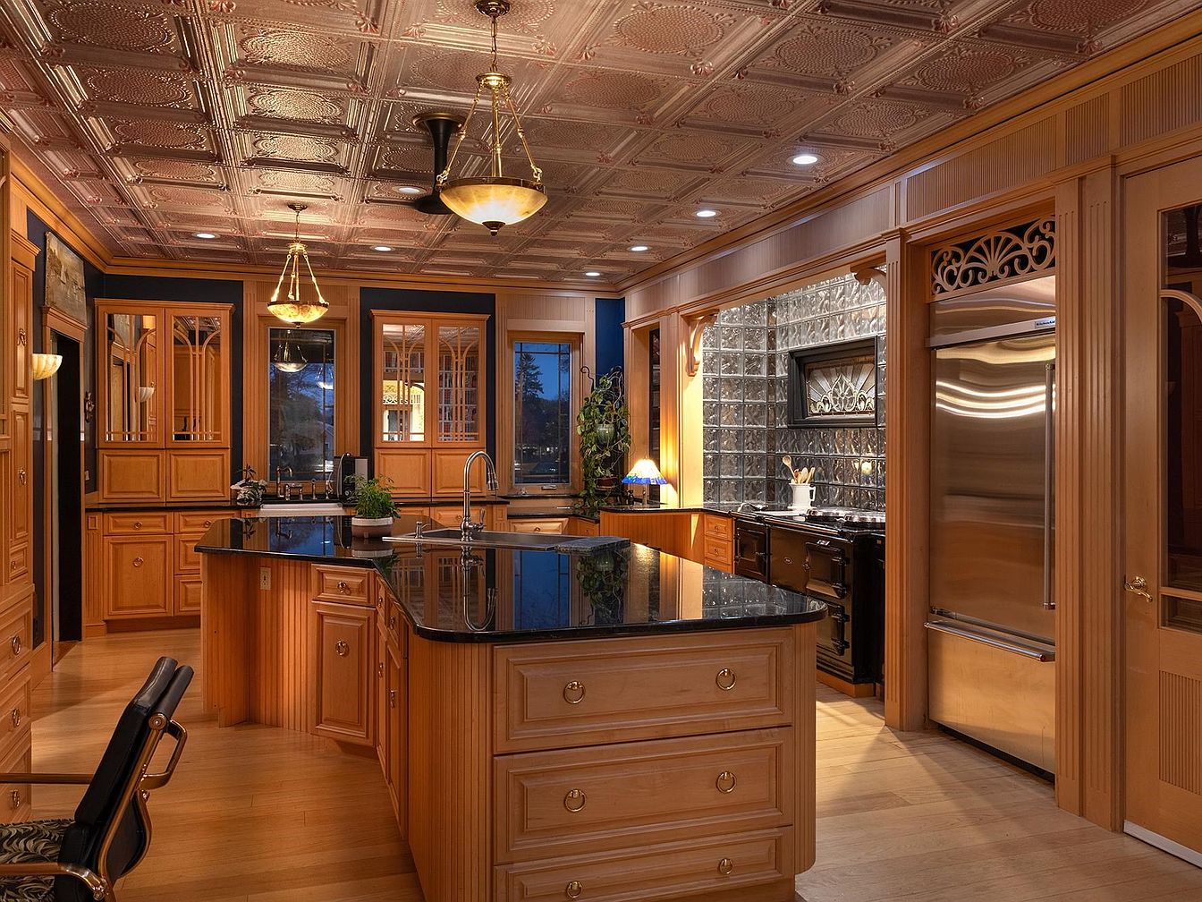 Warm natural wood cabinetry and an expansive black granite-topped island create an inviting centerpiece for this family-friendly kitchen. Ornate details on the cabinet panels and the tin-patterned ceiling add classic elegance, while modern pendant and recessed lighting provide excellent illumination for cooking and entertaining. Ample storage, a double sink in the island, and high-end stainless appliances offer convenience for everyday use and family gatherings. The open shelving and glass-front cabinets are perfect for displaying cherished dishware. Soft, golden wood floors enhance the cozy yet sophisticated atmosphere, making it an ideal space for family connection and culinary creativity.