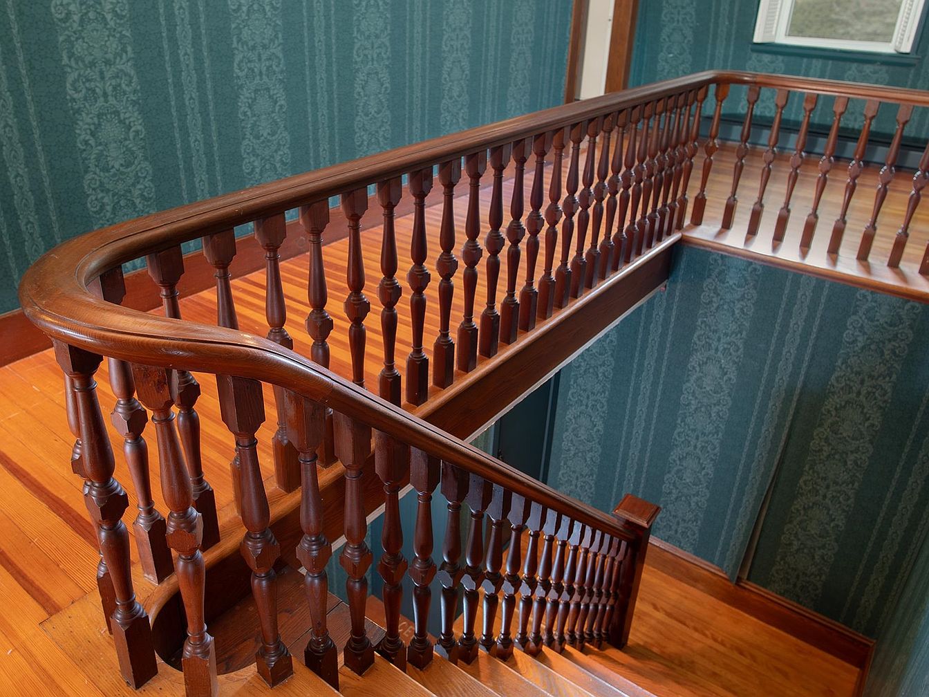 This elegant staircase landing reflects traditional American home design with its beautifully crafted wooden banister and spindles. The rich, warm tones of the polished wood complement the vibrant hardwood floors, adding both warmth and sophistication to the space. Wall coverings in a classic damask pattern with deep teal hues lend a sense of timelessness and coziness, making it ideal for families. The landing provides a spacious, safe transition between floors, with its sturdy railing ensuring child-friendly safety. Abundant natural light streams in from a window, highlighting the craftsmanship and creating an inviting, comfortable atmosphere perfect for everyday living.