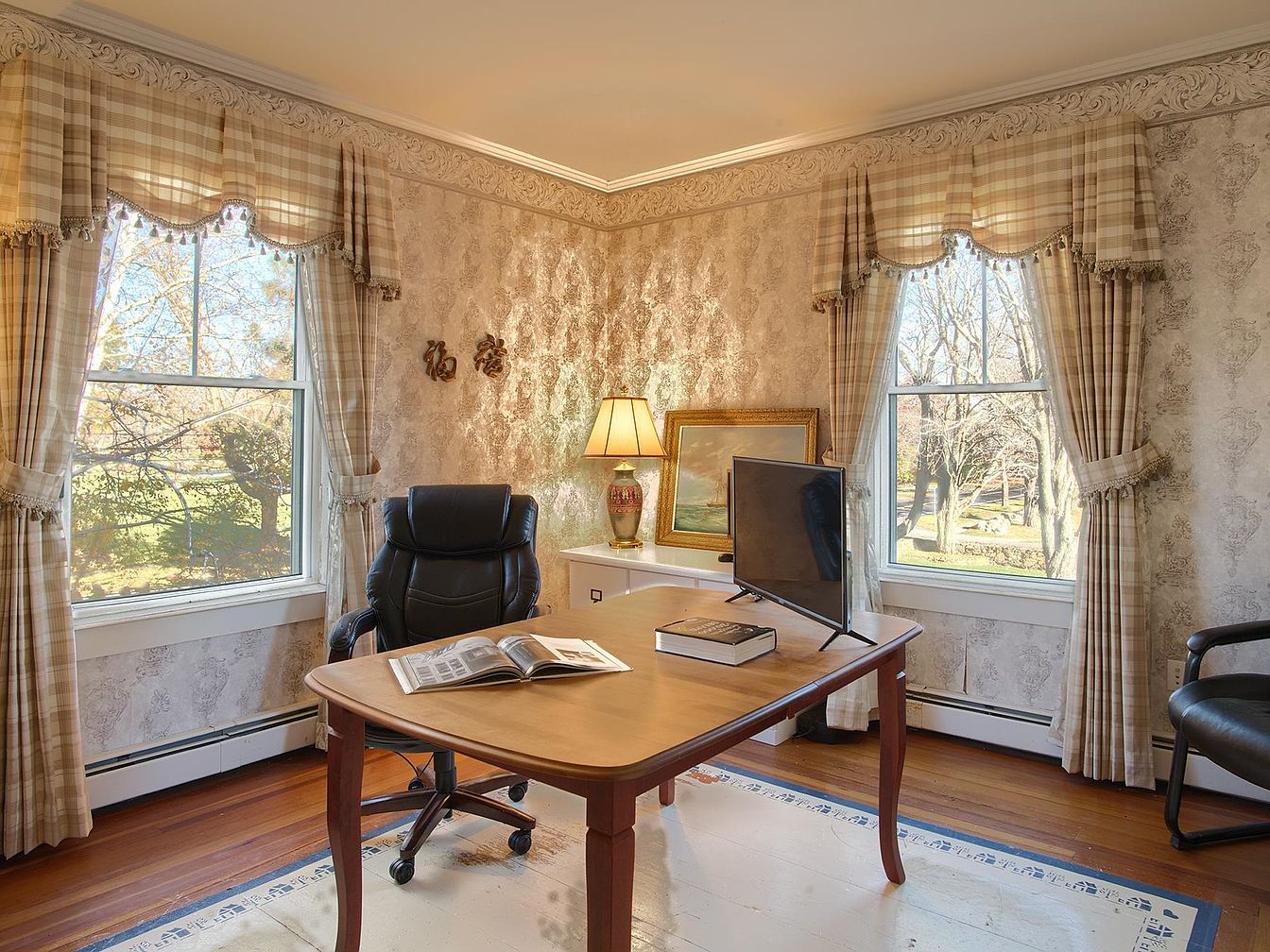 A bright and inviting home office blends traditional charm with functionality, ideal for both remote work and family needs. Large windows bathe the room in natural light and offer a calming view of the outdoors, making the space feel airy and welcoming. Neutral-toned wallpaper with a classic damask pattern and elegant crown molding add sophistication, while plaid curtains introduce a cozy, homey feel. The wood desk is paired with a comfortable black swivel chair, suitable for long hours. Subtle decor, a table lamp, and family-friendly layout ensure that this office can serve as a productive and peaceful retreat for everyone.