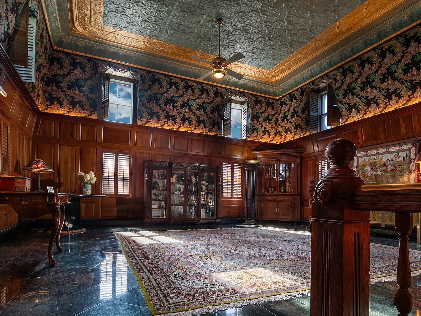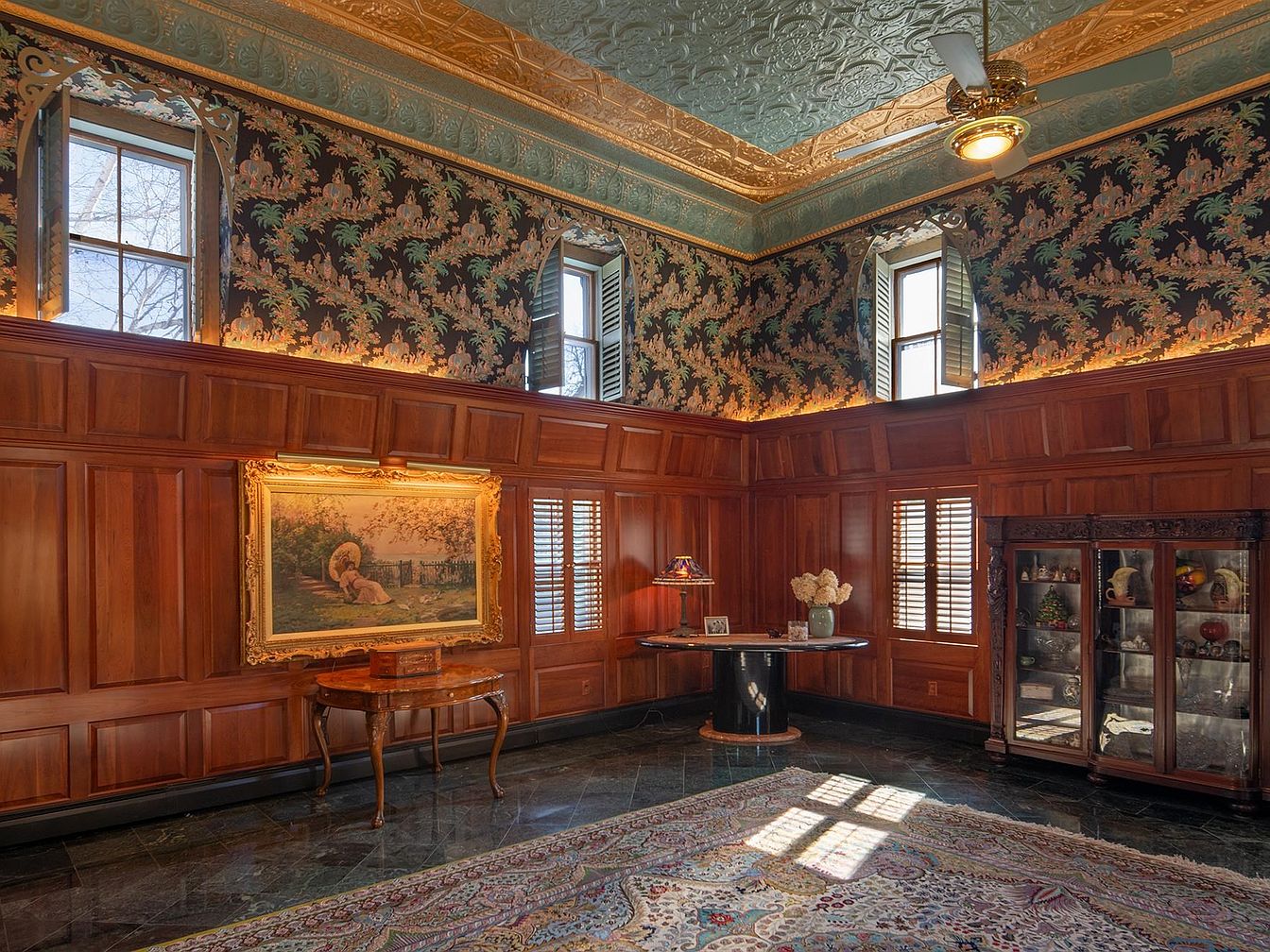 This elegant library sitting room combines classic charm with comfort, offering a spacious and inviting area perfect for family gatherings or quiet reflection. Rich wooden paneling lines the walls, complemented by built-in cabinets and display cases that securely showcase treasured collectibles, making it both family-friendly and sophisticated. The decorative tin ceiling, adorned in gold and silver hues, draws the eye upward, while patterned wallpaper adds depth and character. Natural light filters through tall windows with wooden shutters, reflecting beautifully off the glossy marble floor and ornate area rug. Traditional furnishings and accent lighting provide warmth and timeless appeal.