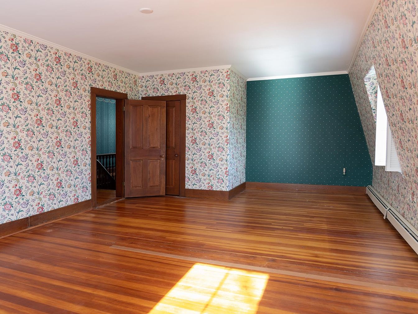 A spacious bedroom corner features a charming vintage aesthetic, highlighted by floral wallpaper that brings warmth and character to the room. The rich, original wood floors complement the deep wood trim around the doorways, creating a harmonious blend of textures. A striking accent wall in deep green polka dots adds visual interest and depth, while windows let in ample natural light. The generous open floor plan leaves plenty of space for children to play or for arranging cozy family-friendly furnishings. Architectural details such as angled ceilings evoke a sense of tradition and comfort, making this a perfect retreat for relaxation.