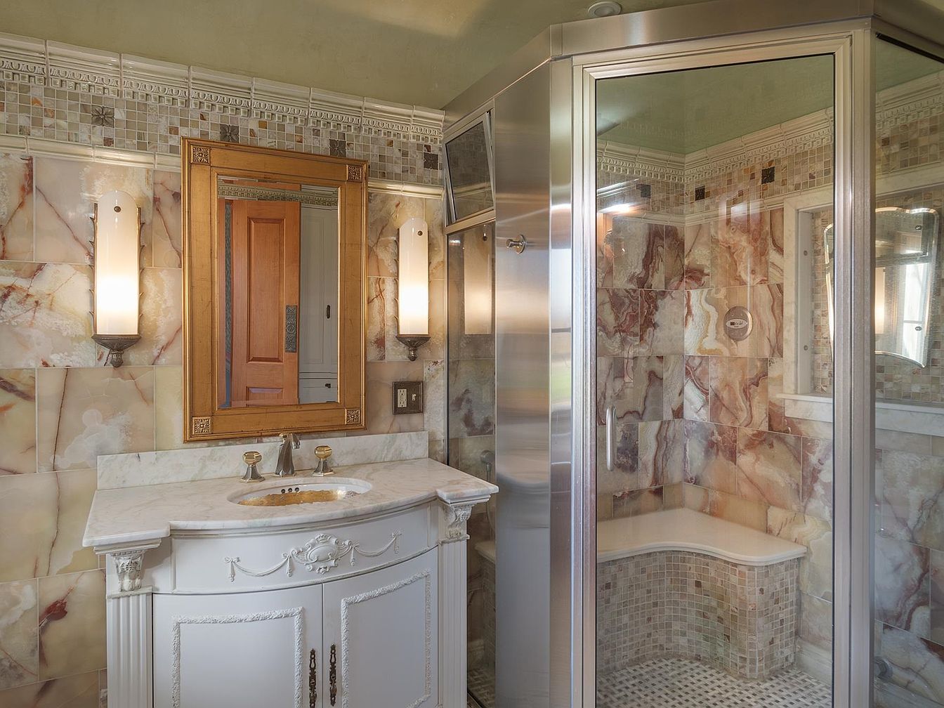 A luxurious bathroom showcases a harmonious blend of elegance and functionality. The vanity features sculpted white cabinetry with ornate detailing and a marble countertop, complemented by an undermount sink and gold-toned fixtures. A large wooden-framed mirror anchors the space, flanked by modern vertical sconces that provide warm ambient lighting. Soft, earth-toned marble tiles cover the walls and flow seamlessly into the walk-in glass shower, where a built-in bench offers comfort and accessibility—perfect for family use. The mosaic tile accents and crown molding add a touch of sophistication, while the neutral palette creates a calming, spa-like atmosphere.