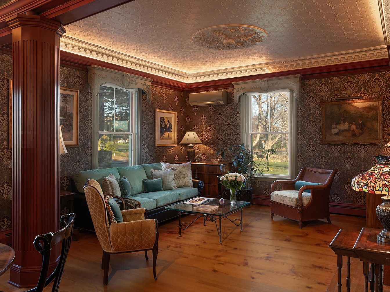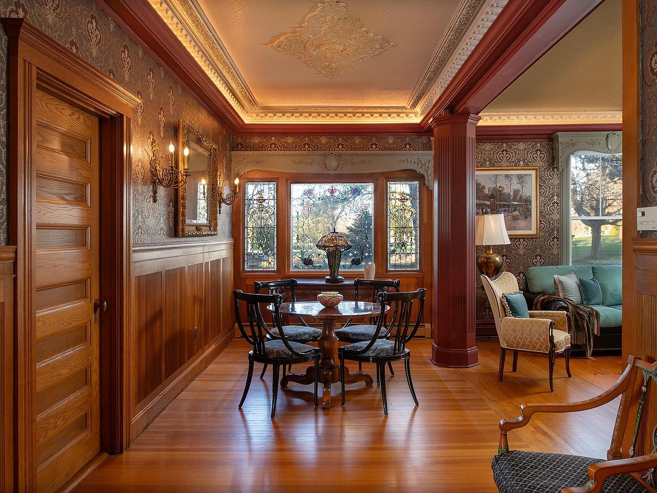 A classic dining area seamlessly flows into a comfortably furnished sitting space, highlighted by warm hardwood floors and rich wood trim. Ornate wallpaper and decorative cornices add Victorian charm, while intricate stained-glass windows capture natural light, lending vibrancy to the atmosphere. A round wooden table with elegant chairs encourages family meals and gatherings, while built-in sconces and a period ceiling medallion provide ambient, welcoming lighting. The adjacent lounge showcases plush seating, throw pillows, and an inviting area for conversation, making this open-plan layout perfect for family-friendly entertaining in a refined, sophisticated setting.