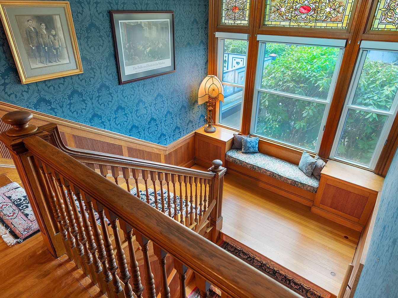 A classic wooden staircase opens to a cozy landing flooded with natural light from large paneled windows. An inviting window seat, cushioned and accented with decorative pillows, creates a family-friendly nook perfect for reading or relaxing. Rich ornamental woodwork and balustrades complement the elegant blue damask wallpaper, while Victorian-style stained glass above the windows adds character. Framed historical photographs enhance the traditional atmosphere. The warm hardwood flooring unites the space, making this a welcoming transition area that blends comfort and style, and offering a scenic lookout ideal for both children and adults to unwind.