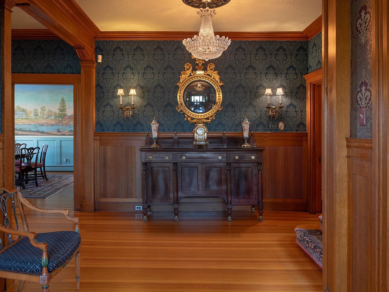 A richly appointed entry hall welcomes guests with classic elegance, featuring warm wood paneling and gleaming hardwood floors that radiate timeless sophistication. Ornate damask wallpaper in deep jewel tones creates a dramatic backdrop for the antique sideboard adorned with decorative urns and an intricately framed mirror. Brass wall sconces and a dazzling crystal chandelier provide ambient light and elevate the space’s regal character. Accented with refined furniture upholstered in patterned navy fabric, the hall is spacious enough for family gatherings or holiday welcomes, while its thoughtful layout offers an inviting transition to the adjacent dining area seen just beyond the threshold.