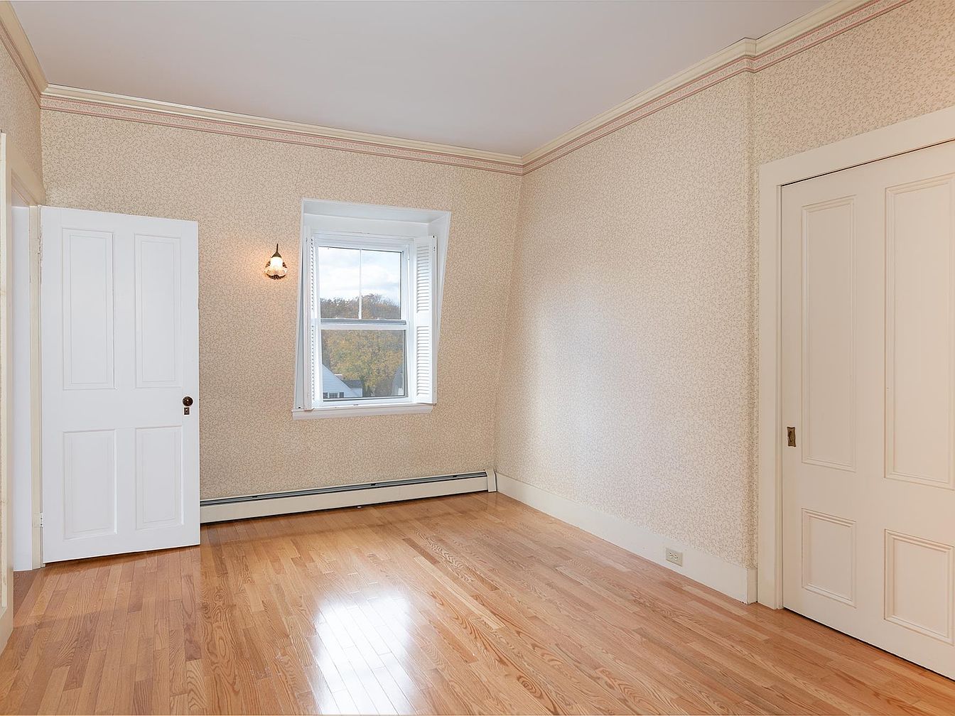 A spacious and inviting bedroom corner with natural light streaming through a centered window, which features charming white shutters. The pale, patterned wallpaper gives the space a gentle, classic feel, complemented by elegant white trim and crown molding. Gleaming hardwood floors add warmth and durability, making it ideal for families with children who need a low-maintenance, yet comfortable surface. Double doors, one swinging, one sliding, provide flexibility for furniture arrangement and storage. A wall-mounted sconce offers cozy ambient lighting. This versatile room’s soft beige and cream palette creates a welcoming and restful atmosphere, perfect for relaxation or quiet moments.