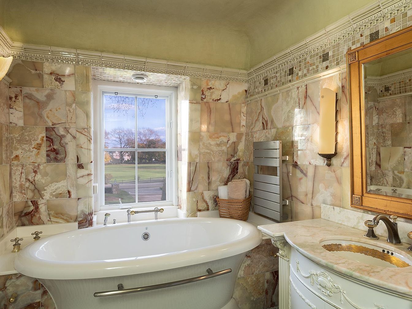 A timeless bathroom design featuring a deep, freestanding bathtub perfectly positioned beneath a large window that floods the space with natural light and offers a serene view of the outdoors. Elegant marble tiles with warm, earthy tones wrap the walls and vanity, creating a sense of cozy opulence. Ornate detailing on the cabinetry and gold-accented fixtures add a touch of classic luxury. Soft, ambient lighting is provided by a stylish wall sconce near the ornate, gold-framed mirror. Family-friendly touches include neatly stacked plush towels in a woven basket, ensuring comfort and practicality for all members of the household.
