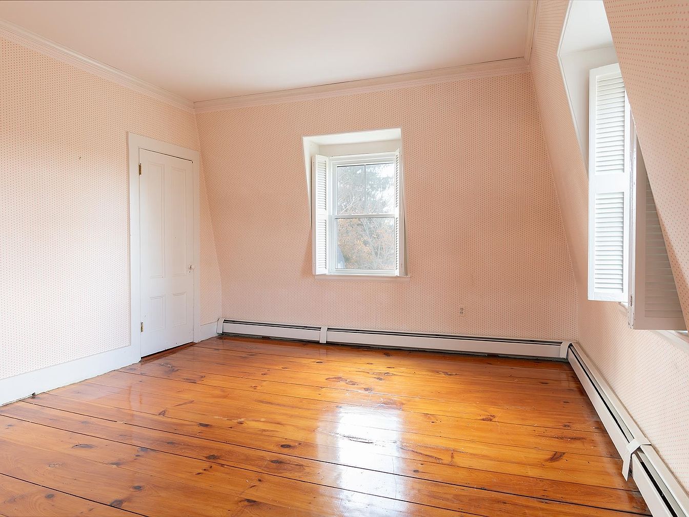 Charming corner of a bedroom featuring soft blush wallpaper with tiny patterns that create a cozy, calming atmosphere. The gently sloping ceiling adds character and accentuates the architectural uniqueness of the space. Natural light pours through the window, highlighting the rich, warm tones of the polished wood plank flooring. White trim, baseboards, and door frames provide a crisp contrast, tying the look together. Shuttered window panels offer privacy and safely vent sunlight, making the room ideal for children or families. The uncluttered, open layout leaves plenty of options for customizing with beds, desks, or play areas as needed.