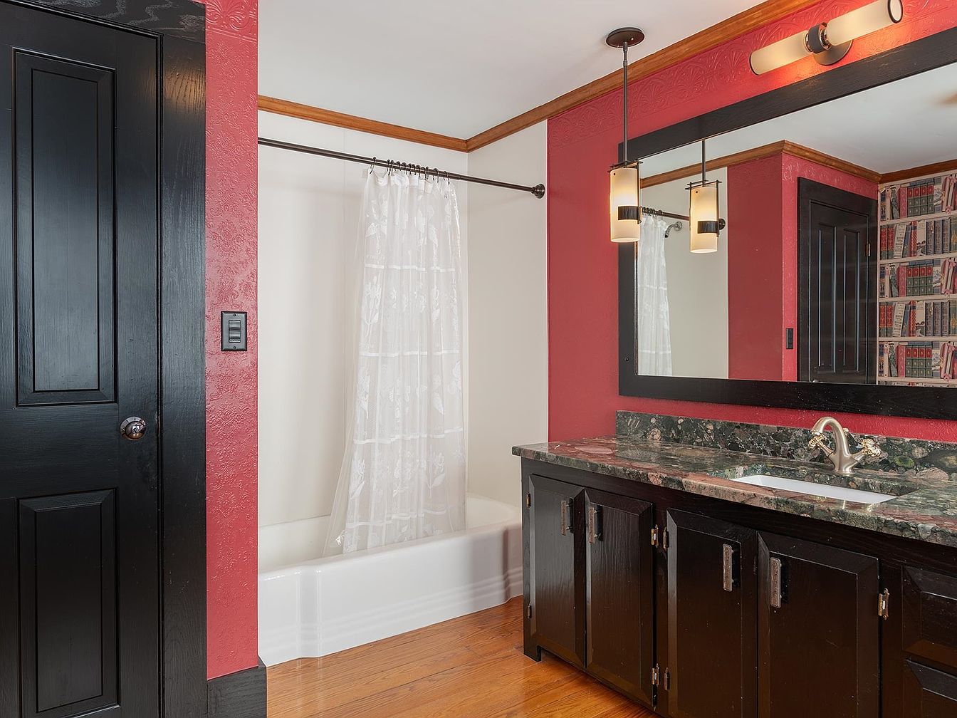 This bathroom showcases a bold, family-friendly space with striking red walls accented by black trim and cabinetry. The large mirror framed in black enhances the feeling of spaciousness, while pendant lights add modern flair and ample illumination for everyday routines. Durable stone countertops and a single undermount sink provide both practicality and style, making it suitable for family use. The shower-tub combination, dressed with a delicate, lacy curtain, brings a touch of softness to the clean lines and bold colors. Warm wood floors and crown molding add warmth and balance, creating a welcoming and functional environment.