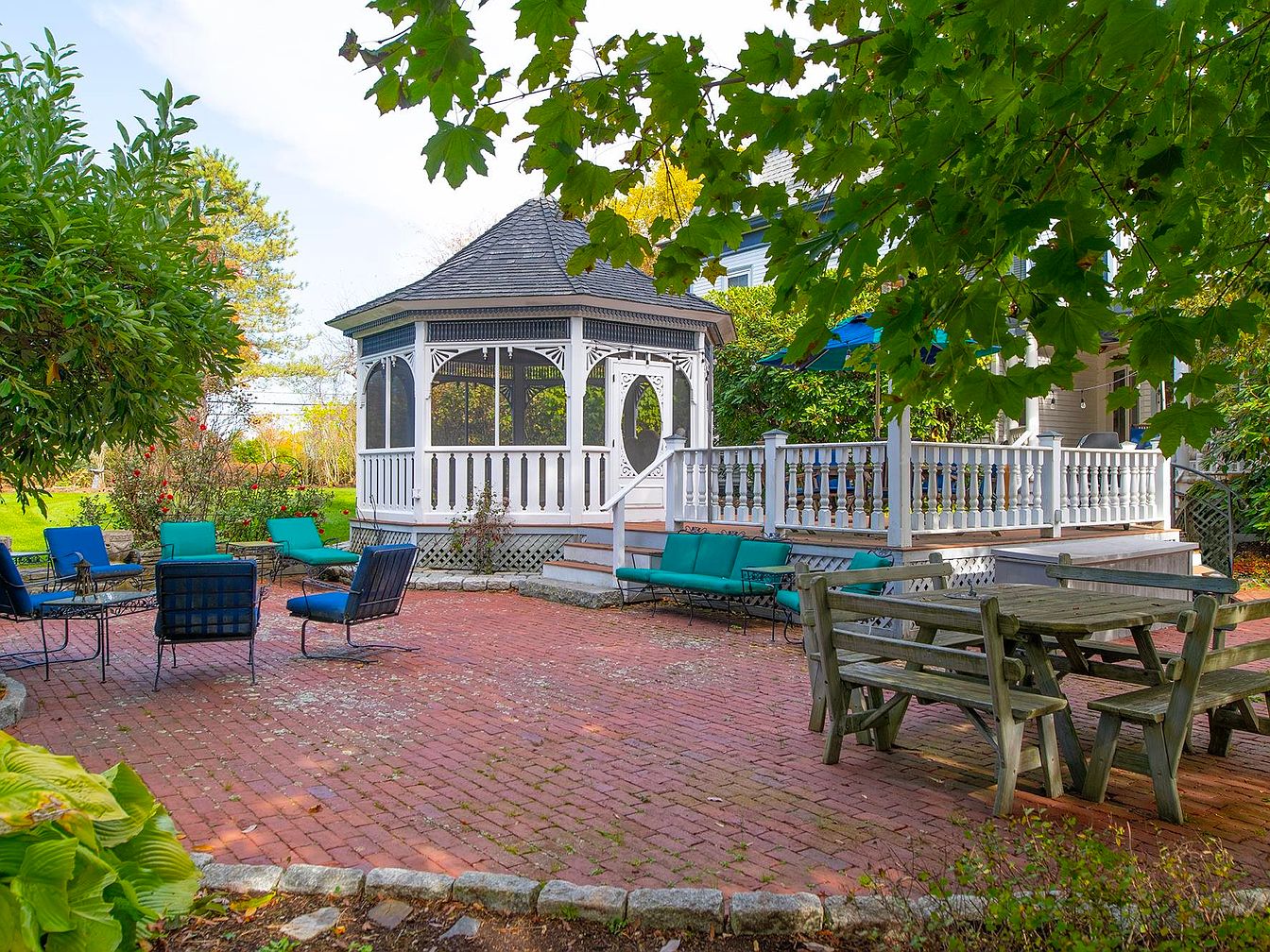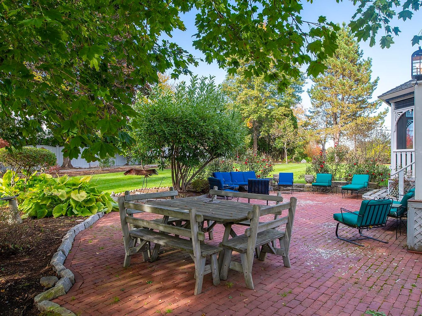 This spacious backyard patio boasts a charming, rustic brick floor surrounded by lush greenery and mature trees, offering a serene retreat for family gatherings and entertaining. A large wooden picnic table with matching benches takes center stage, perfect for outdoor meals or crafts with the kids, while the surrounding seating area, furnished with vibrant blue and teal cushioned chairs, provides ample space for conversation and relaxation. The open lawn and landscaped flower beds create a picturesque, family-friendly environment, adding pops of color throughout. Architectural details like the gazebo structure and curved stone borders add character and define the inviting outdoor living space.