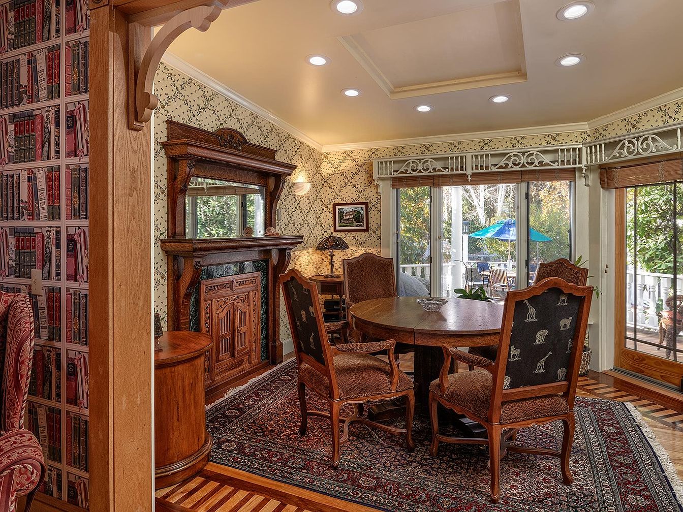 This inviting dining area blends classic charm with family-friendly warmth, featuring a round wooden table surrounded by elegant, upholstered chairs that display playful animal patterns, perfect for encouraging conversations and accommodating both adults and children. The walls are adorned with delicate floral wallpaper, and the built-in mantle with a large mirror creates a focal point framed in rich woodwork, adding to the room’s vintage appeal. Large sliding glass doors open out to a lush patio, allowing natural light to flood the space. The intricate ceiling trim, traditional Oriental rug, and uniquely patterned hardwood floors offer sophisticated visual interest, making this space ideal for daily meals or special gatherings.
