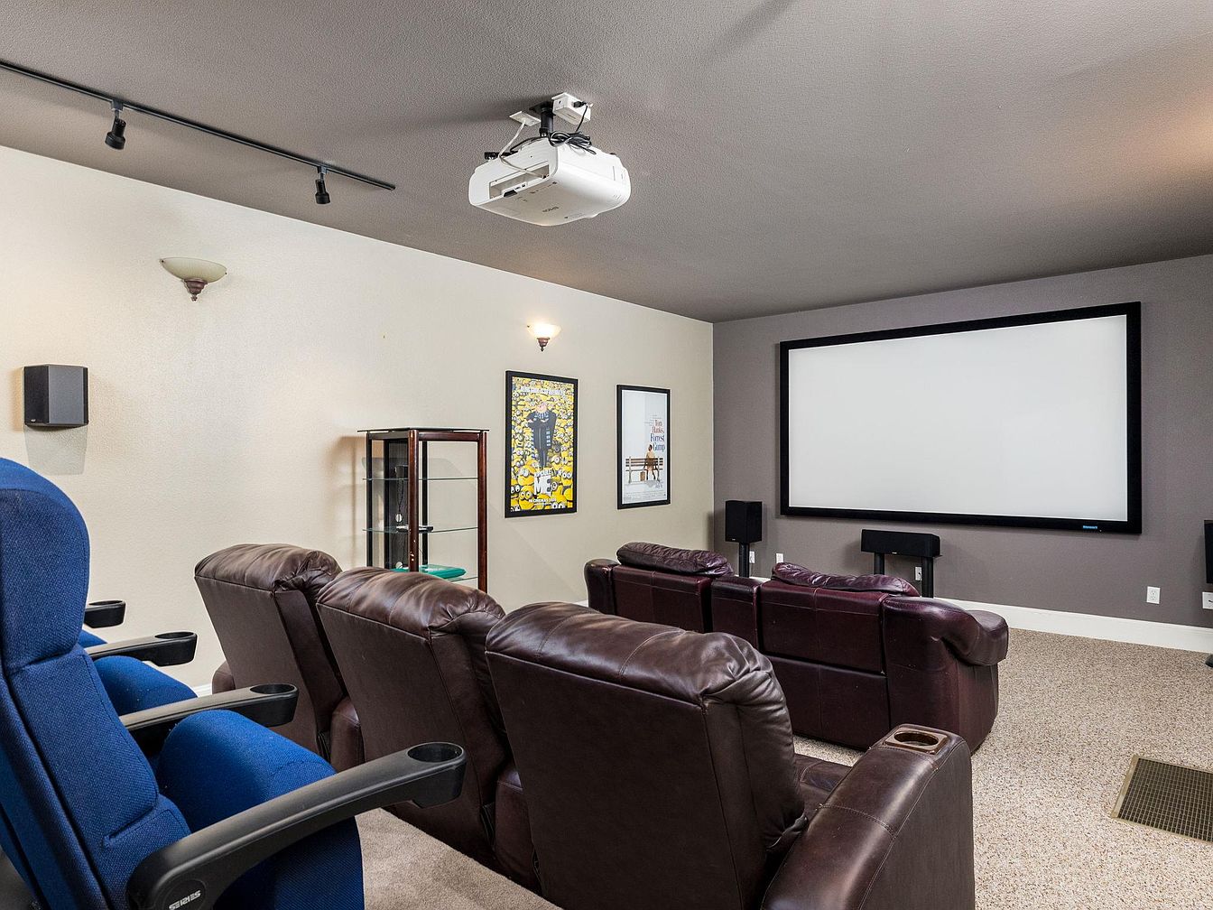 A spacious home theater designed for family movie nights and entertainment features rows of comfortable leather recliners and plush blue theater seats, each equipped with cup holders for convenience. The room is defined by a large projection screen set against an accent wall, complemented by surround sound speakers and subtle wall-mounted lighting. Neutral beige walls and carpeting create a cozy, inviting atmosphere, while framed artwork and a glass display cabinet add personal touches. This multi-tiered seating arrangement ensures everyone has a great view, making it an excellent family-friendly space for gatherings and cinematic experiences.