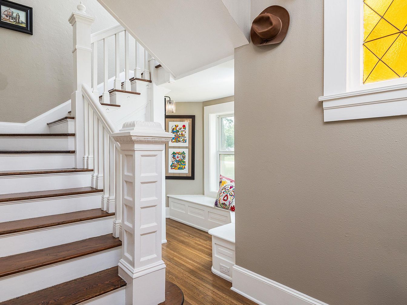 A beautifully crafted staircase features rich, dark wood treads paired with crisp white risers and balusters, creating a timeless and inviting transition between levels. Soft beige walls set a calm, neutral tone throughout the space, while a warm yellow stained-glass window adds a touch of cheerful color and character. Tucked beneath a window, a cozy built-in bench offers an ideal reading nook with patterned pillows for comfort, perfect for family relaxation or a quiet escape. Two vibrant framed art pieces brighten the corner, further enhancing the welcoming, family-friendly atmosphere of this transitional area. Classic architectural details complete the look.