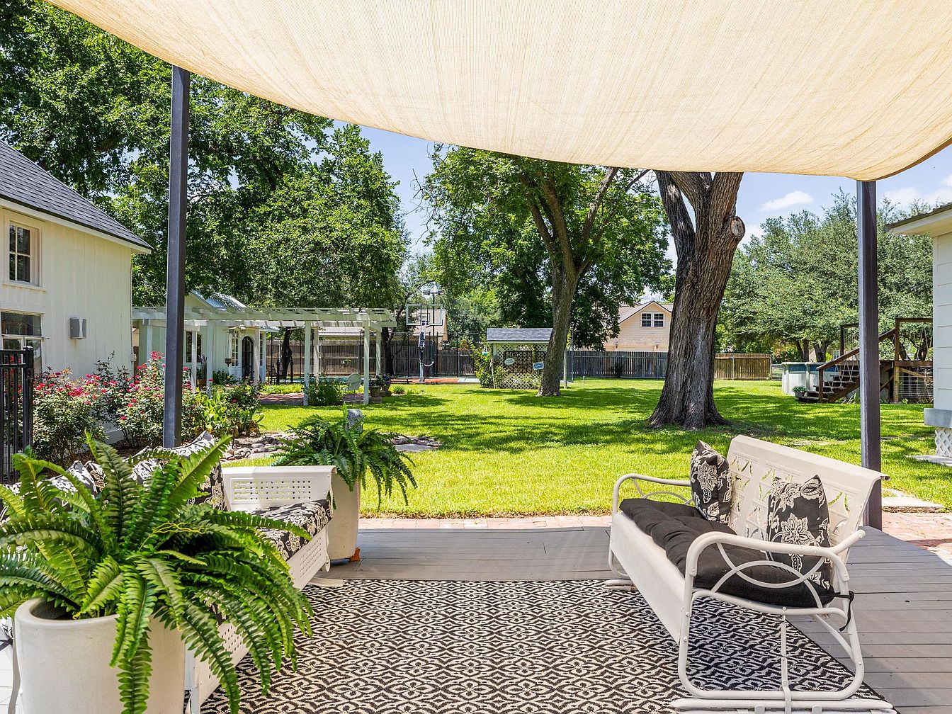 This inviting backyard patio features a cozy seating area under a stylish fabric shade, making it perfect for relaxing with family or entertaining guests. The space is anchored by a patterned outdoor rug and adorned with lush potted ferns, which add a vibrant touch of greenery. Comfortable benches with decorative cushions offer ample seating, complementing the serene view of the sprawling lawn and mature trees. Attractive landscaping with flowering shrubs and a white pergola create additional visual interest, while the spacious, sunlit yard provides plenty of room for kids to play or for hosting family gatherings in a safe, enclosed environment.