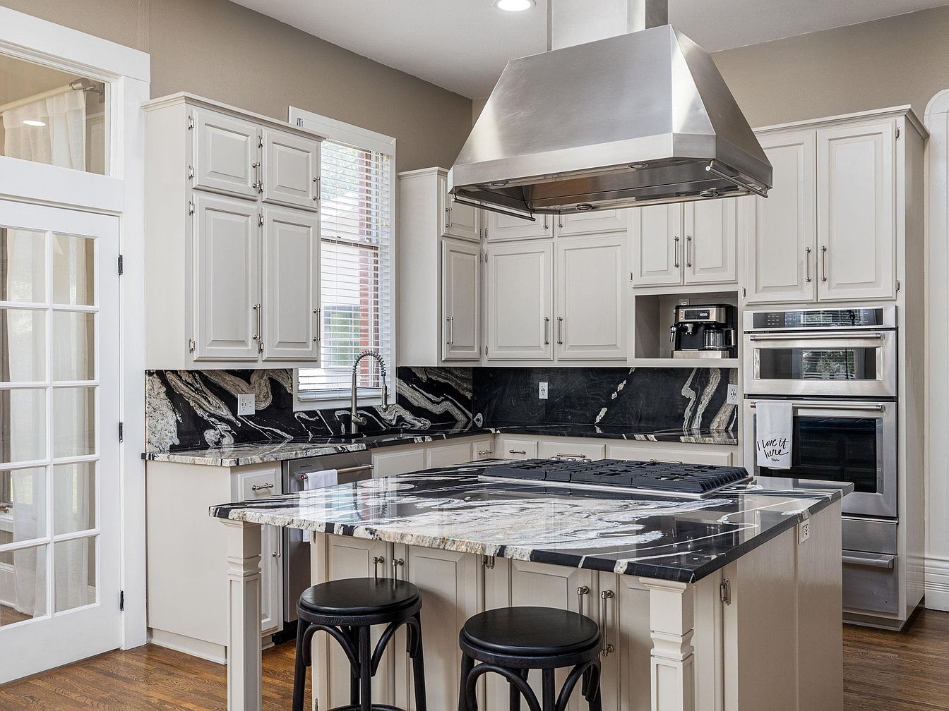 A modern kitchen featuring a spacious island with silky black-and-white veined granite countertops, perfect for family meal prep or casual breakfasts. Soft cream cabinetry creates a welcoming atmosphere, while stainless steel appliances and a statement hood add professional-grade functionality. French doors and tall windows let in abundant natural light, highlighting the elegant contrast between the dramatic countertops and neutral cabinets. The layout encourages togetherness, with stools tucked beneath the island for easy conversation or children’s snacks. Warm hardwood floors ground the space, balancing contemporary finishes with comfort, a sophisticated yet family-friendly hub for daily life and entertaining.