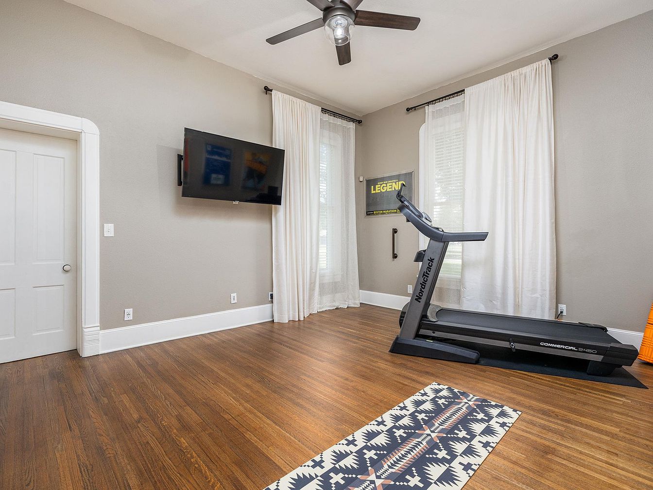 A bright and inviting home gym blends comfort and functionality, featuring sleek, light gray walls complemented by crisp white trim and flowing white curtains that allow plenty of natural light. The space is centered around a high-quality treadmill and a patterned yoga mat, making it perfect for family workouts or individual fitness routines. The mounted flatscreen TV offers entertainment during exercise while the motivational wall art adds extra inspiration. Warm, polished hardwood floors give the room a cozy, welcoming feel, and the ceiling fan provides air circulation for comfort. The minimalist layout keeps the area uncluttered and spacious.