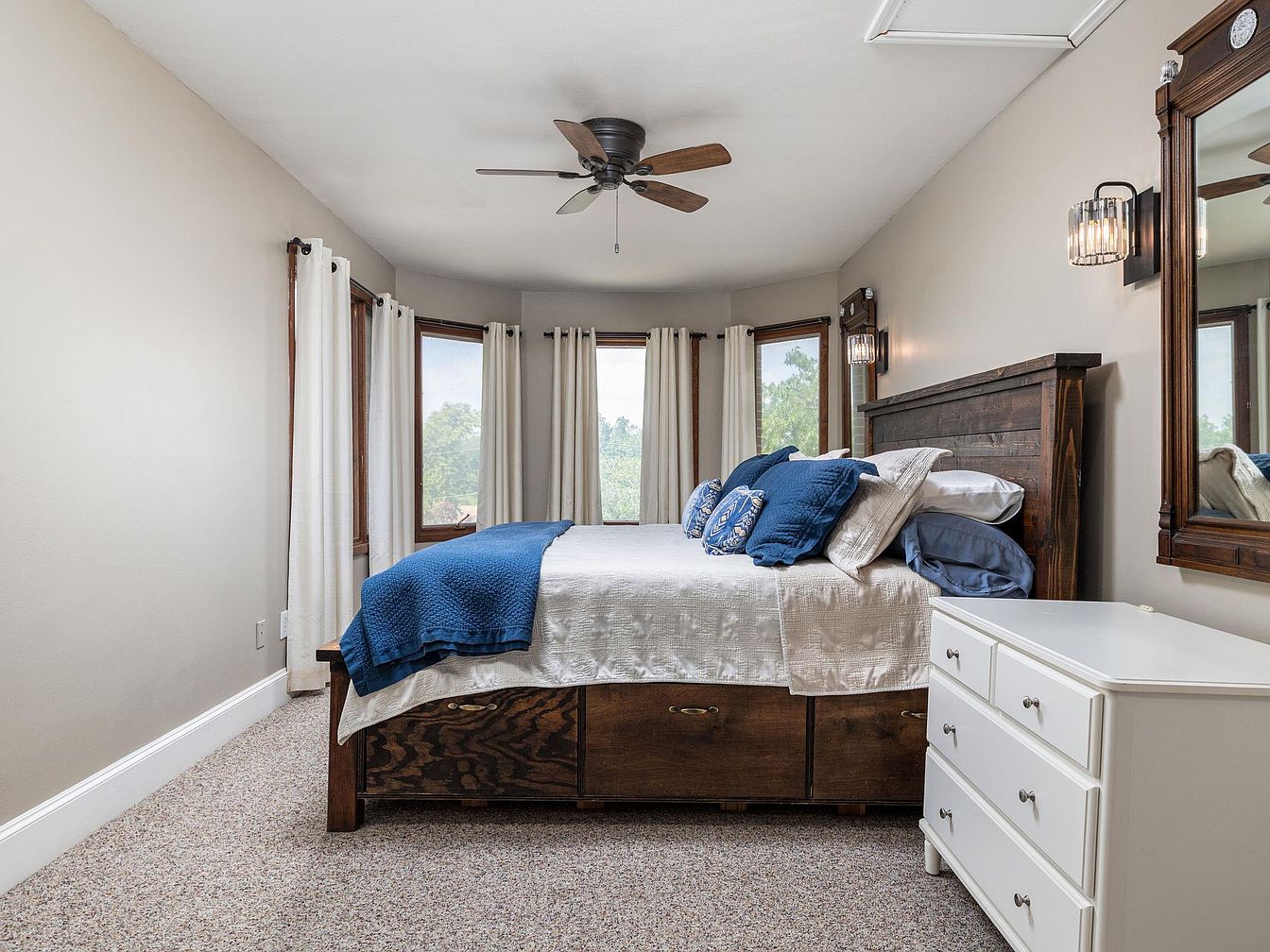 This serene bedroom features a spacious layout with a cozy bay window area that fills the room with natural light and offers relaxing views of greenery. The soft beige walls create a calm, neutral background, complemented by plush, light carpeting for comfort underfoot. A substantial wooden bed with built-in storage anchors the space, dressed in white linens and textured blue accents for a touch of color. The room is family-friendly with ample storage and uncluttered traffic areas, ideal for children or guests. Rich wooden trim, matching nightstands, classic sconces, and a ceiling fan give a timeless, welcoming appeal.