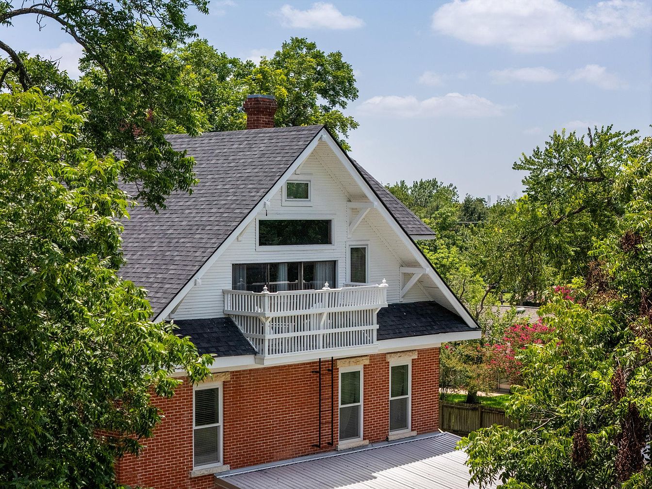 This inviting upstairs balcony area is nestled beneath the sharply peaked roofline of a classic American Craftsman-style home. The balcony is framed by crisp white railings and decorative trim, creating a charming and peaceful spot to enjoy morning coffee or evening sunsets. Brickwork on the lower level adds warmth and a timeless touch, while tall windows invite plenty of natural light into the home, making the space feel open and airy. Surrounded by mature trees, this spot is ideal for families, offering privacy and a serene atmosphere to relax and connect with nature right outside your door.