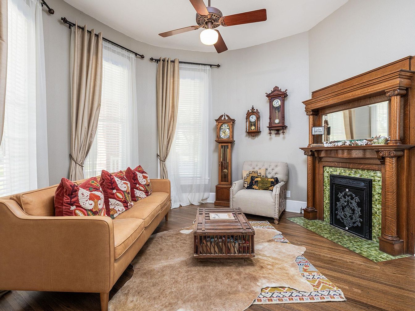 Warmth and character define this inviting living room, featuring a classic wooden mantelpiece with decorative molding and a vintage-inspired tiled fireplace. Soft natural light flows through large windows adorned with cream-colored drapes and sheer curtains, creating a calming ambiance. A caramel-toned sofa, adorned with colorful patterned pillows, offers cozy seating, while a tufted accent chair adds an extra touch of comfort. The eclectic coffee table and cowhide rug introduce rustic charm and texture, perfect for family gatherings or relaxed evenings. The collection of antique wall and standing clocks adds personality, celebrating tradition within a friendly, harmonious space.