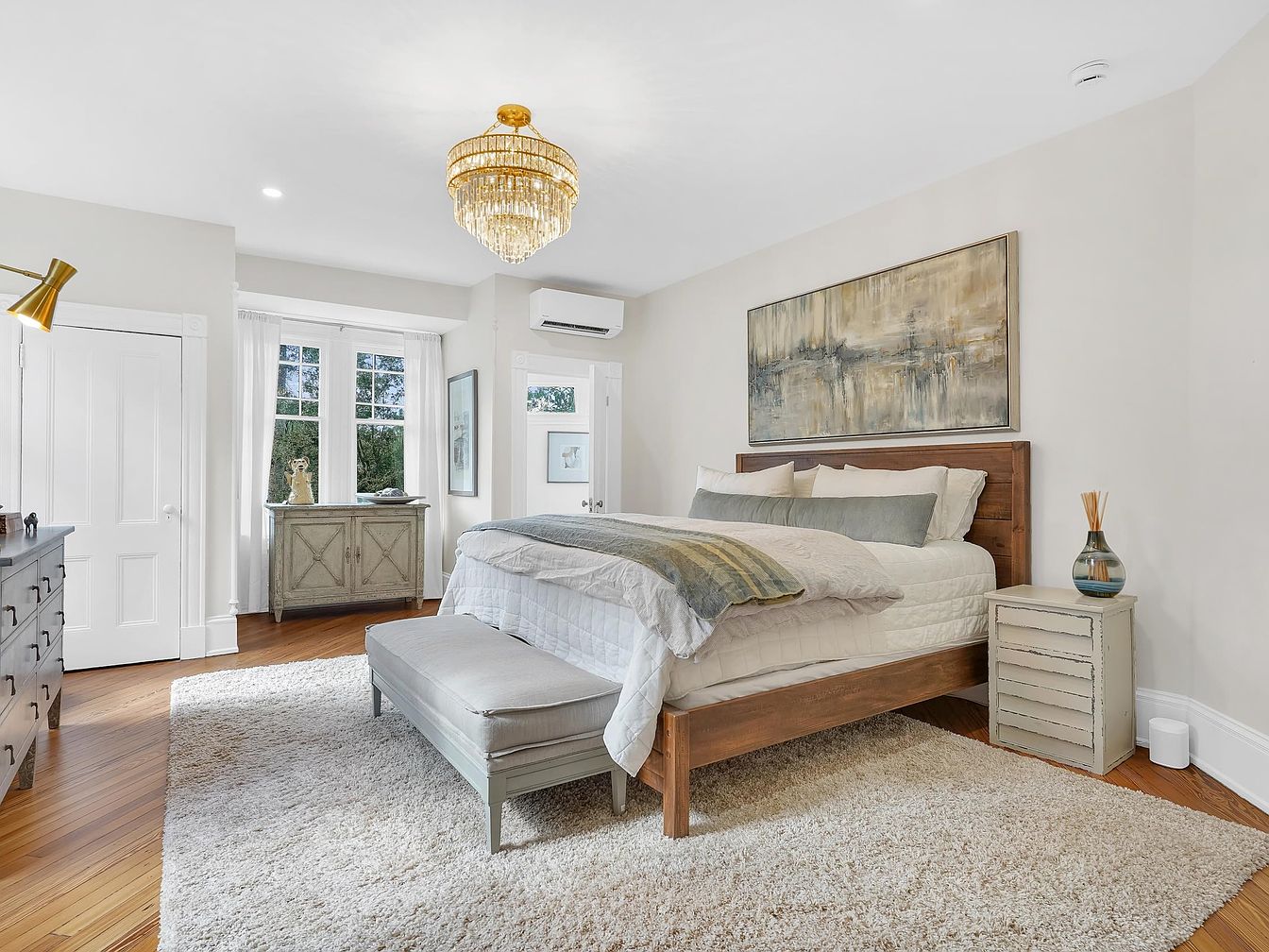 Warm hardwood floors and a plush cream area rug establish a cozy base for this master bedroom, making it inviting for family relaxation or quiet retreats. The bed, with its wooden frame and neutral-toned linens, is complemented by a tufted bench, perfect for reading or lounging. Light pours through large windows, accentuated by sheer curtains, illuminating the soft beige walls and elegant crown molding. An eye-catching gold chandelier adds sophistication, while modern and rustic furnishings blend seamlessly. Wall art and decorative accents create a tranquil, balanced aesthetic, ensuring both comfort and style in a space ideal for restful nights and peaceful mornings.
