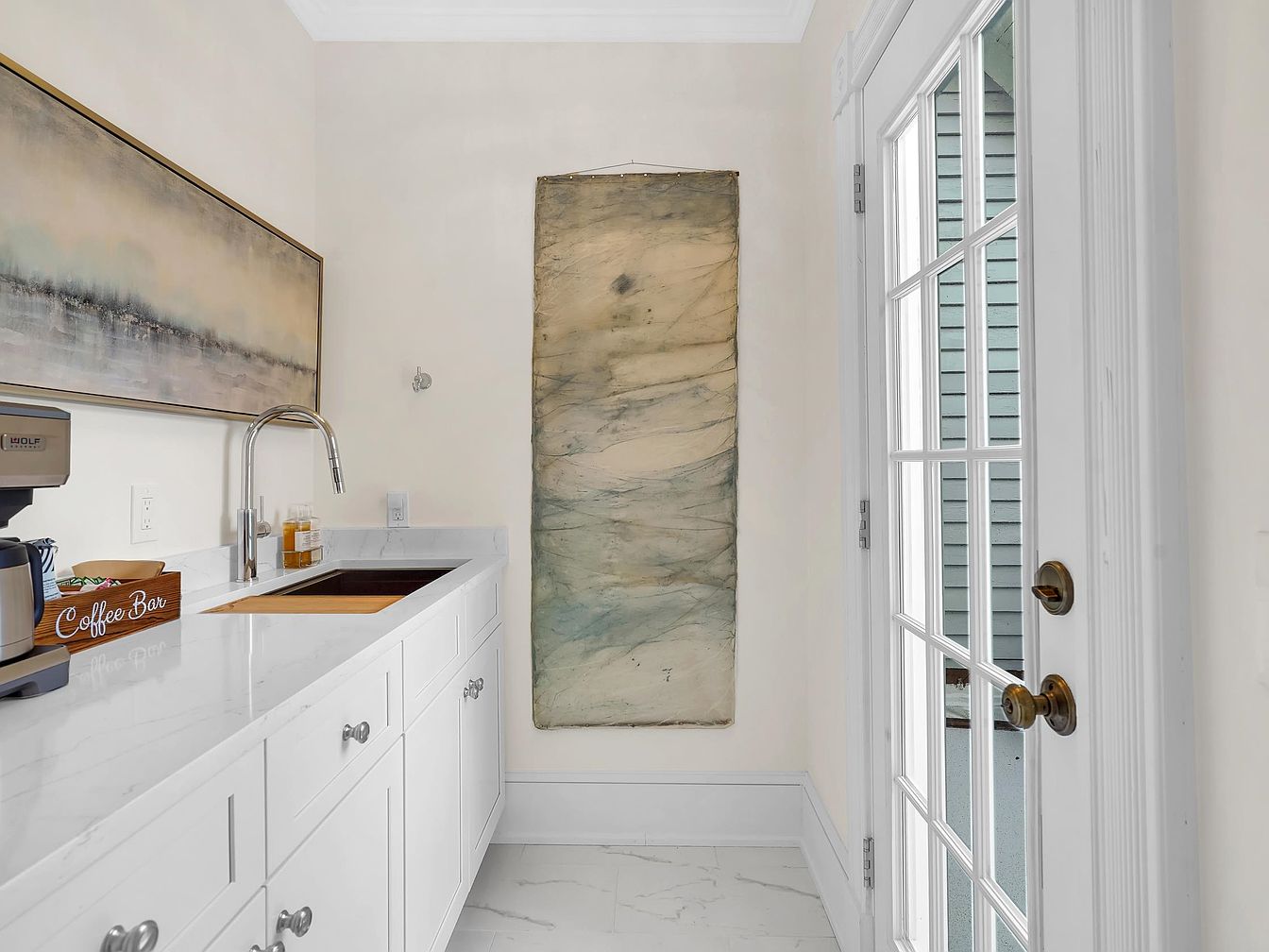 This butler’s pantry nook offers both function and style, featuring crisp white cabinetry with polished silver knobs and sleek marble countertops for a clean, contemporary look. An inviting coffee bar station with an espresso machine and thoughtfully labeled accessories caters to daily family needs or entertaining guests. The deep under-mount sink with a modern curved faucet is perfect for prep work. Artistic touches are visible in the serene abstract wall art and the textured hanging tapestry, adding visual interest and warmth. Natural light filters in from the French door, brightening the space and creating an open, airy ambiance perfect for busy households.