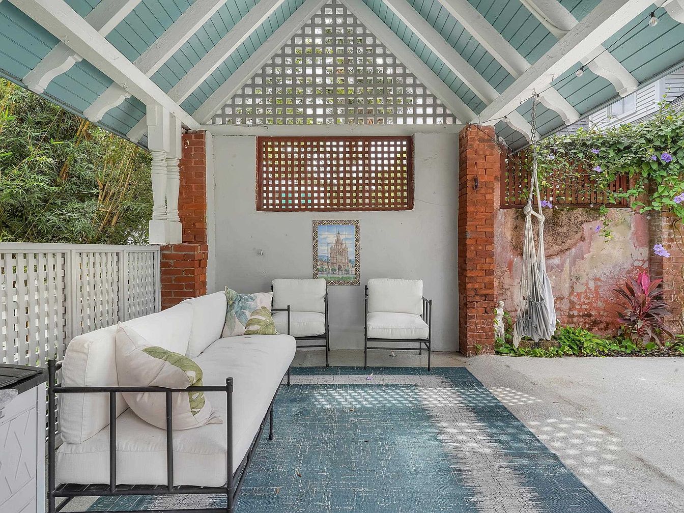 A beautifully landscaped backyard offers an inviting sanctuary for family gatherings and relaxation. The winding red brick pathway leads past lush tropical plants and trees to a cozy outbuilding, featuring a charming brick and wood façade and a shaded lounge area with seating. The main home’s classic grey exterior and wooden porch evoke vintage charm while providing easy access to the yard. String lights drape along an ivy-covered fence, casting a warm, welcoming glow for evening enjoyment. This space marries elegance and comfort, blending soft greens, natural reds, and wood tones for an outdoor haven any family would enjoy.