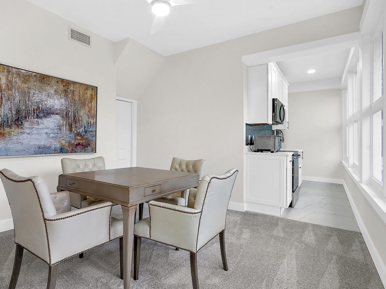 A welcoming dining nook, seamlessly connected to a compact kitchen, invites family gatherings and casual meals. The neutral palette of soft beige walls and plush gray carpet creates a tranquil atmosphere, complemented by a modern painting that brings gentle color to the space. Four padded, button-tufted chairs surround a sturdy wooden table, providing a comfortable and safe setting for kids and adults alike. Tall windows alongside the kitchen fill the area with natural light, enhancing the fresh ambiance. The kitchen’s white cabinetry and sleek appliances lend a clean, contemporary touch, ideal for both everyday living and entertaining guests.