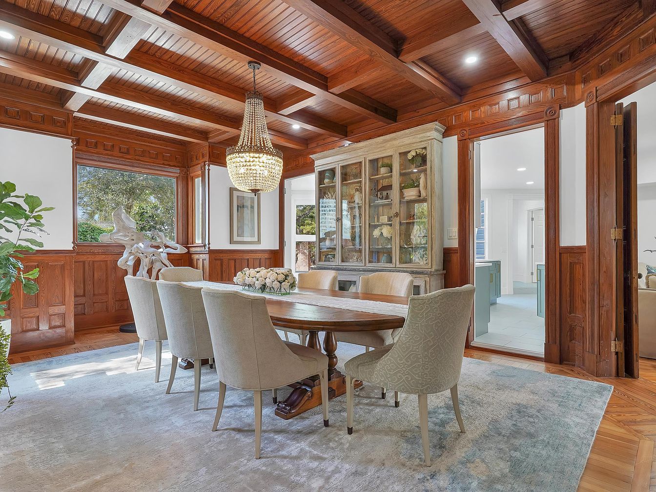 A stately dining room graced with rich wooden coffered ceilings and detailed wood wall paneling, creating an atmosphere of warmth and elegance. The space centers around a long, oval wooden dining table surrounded by eight plush, upholstered chairs, perfect for lively family gatherings or dinner parties. An ornate crystal chandelier adds grandeur above, while a large window allows soft, natural light to accent the room. An antique-style glass-fronted cabinet displays decorative items, adding character. Soft neutral tones in the rug and furniture provide balance to the deep woodwork, offering an inviting yet sophisticated ambience suitable for any family.