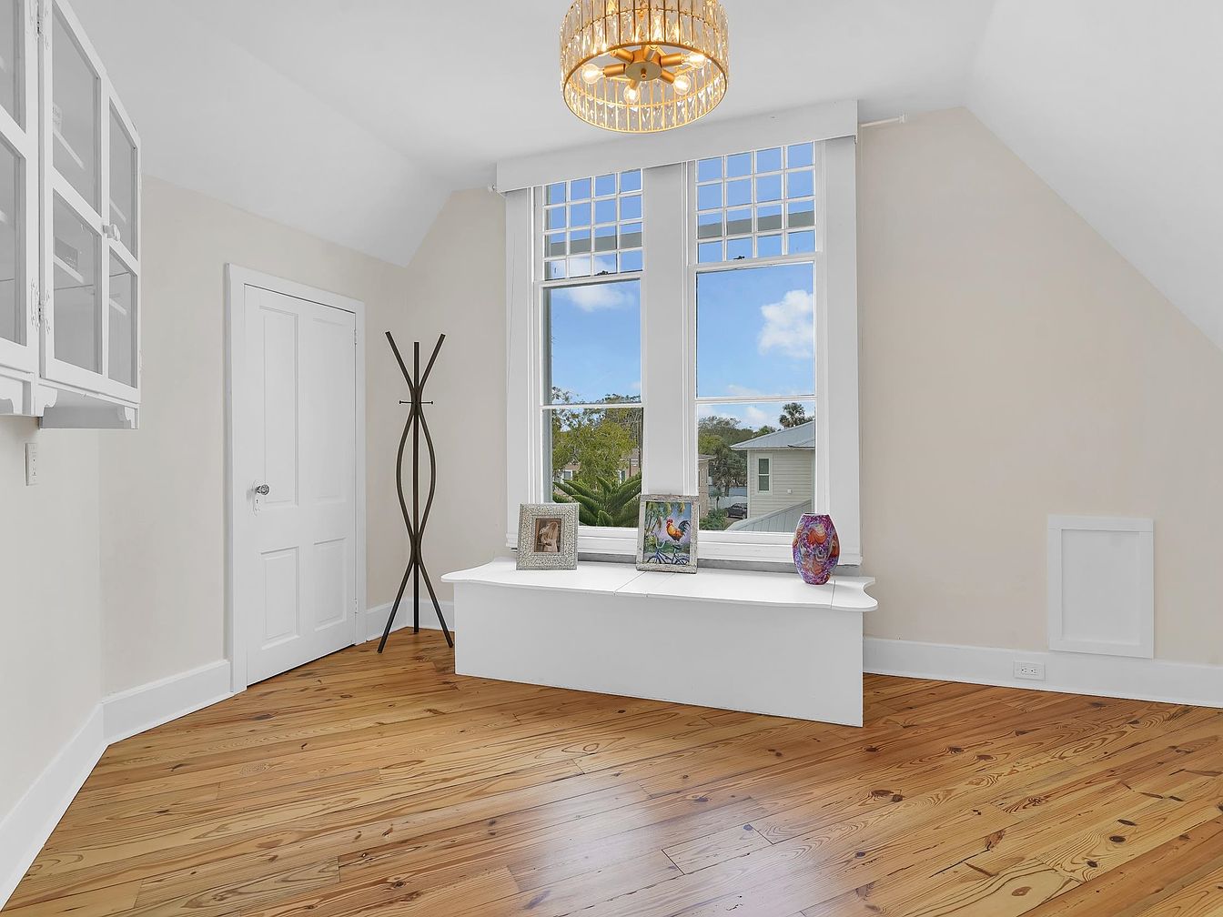 A bright and inviting window nook features large, multi-paned windows that flood the room with natural light, offering serene views of the neighborhood. The cozy built-in bench beneath the windows provides a perfect spot for reading or relaxing, with decorative pieces and personal touches enhancing the welcoming atmosphere. Warm, honey-toned hardwood flooring contrasts beautifully with the crisp white trim and soft beige walls, creating a calm and versatile backdrop for family life. Practical built-in cabinetry offers storage, while the modern chandelier adds a touch of sophistication, making this space both functional and stylish for all ages.