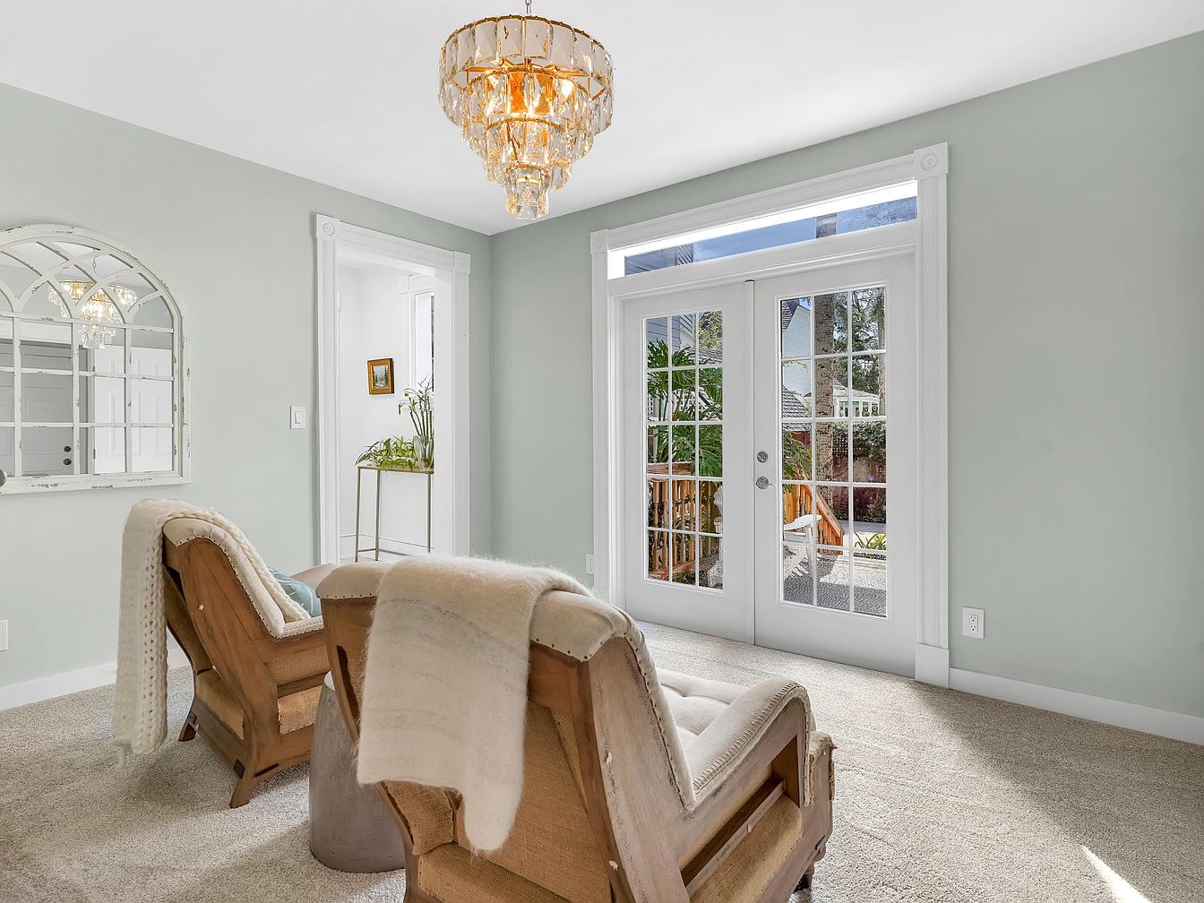 Bright and inviting, this sunroom entrance features double French doors that open to the backyard, creating seamless indoor-outdoor living. The soft pastel walls enhance the abundance of natural light, while plush neutral carpeting adds comfort for family gatherings or quiet moments. Wooden armchairs with cozy throws invite relaxation and conversation, making it a welcoming spot for all ages. A glimmering chandelier offers a touch of elegance, and a decorative arched mirror adds depth to the space. The carefully chosen details, like crisp white trim and thoughtfully placed plants, create a warm, family-friendly ambiance perfect for daily enjoyment.