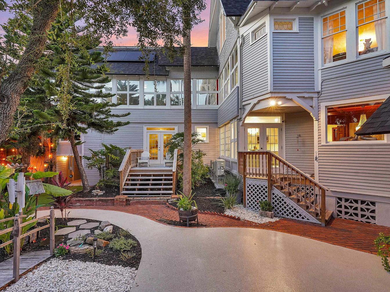 A welcoming backyard entrance highlights both comfort and classic architectural elegance. Soft gray siding and tall windows provide plenty of natural light, while detailed trim and wooden porch stairs add timeless charm. The space features multiple entry points with French doors, ideal for easy indoor-outdoor flow for family gatherings or playtime. Lush landscaping with tropical plants frames a curving walkway and brick accents, creating a picturesque setting. Warm outdoor lighting and a small bridge add a whimsical, family-friendly touch, making this garden-inspired entryway perfect for relaxation, casual entertaining, and safe play for children surrounded by nature.