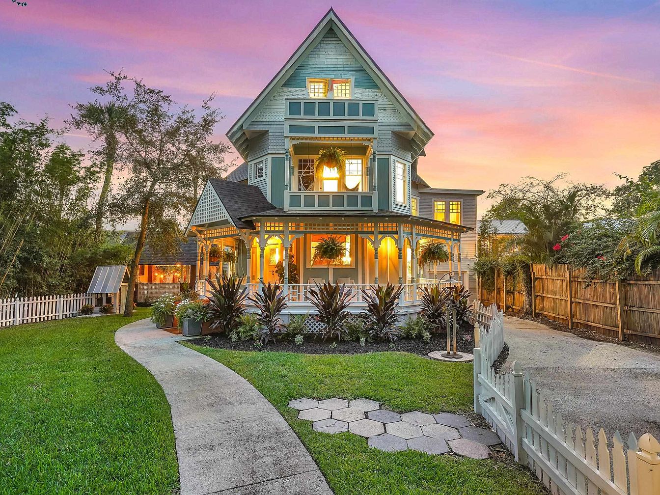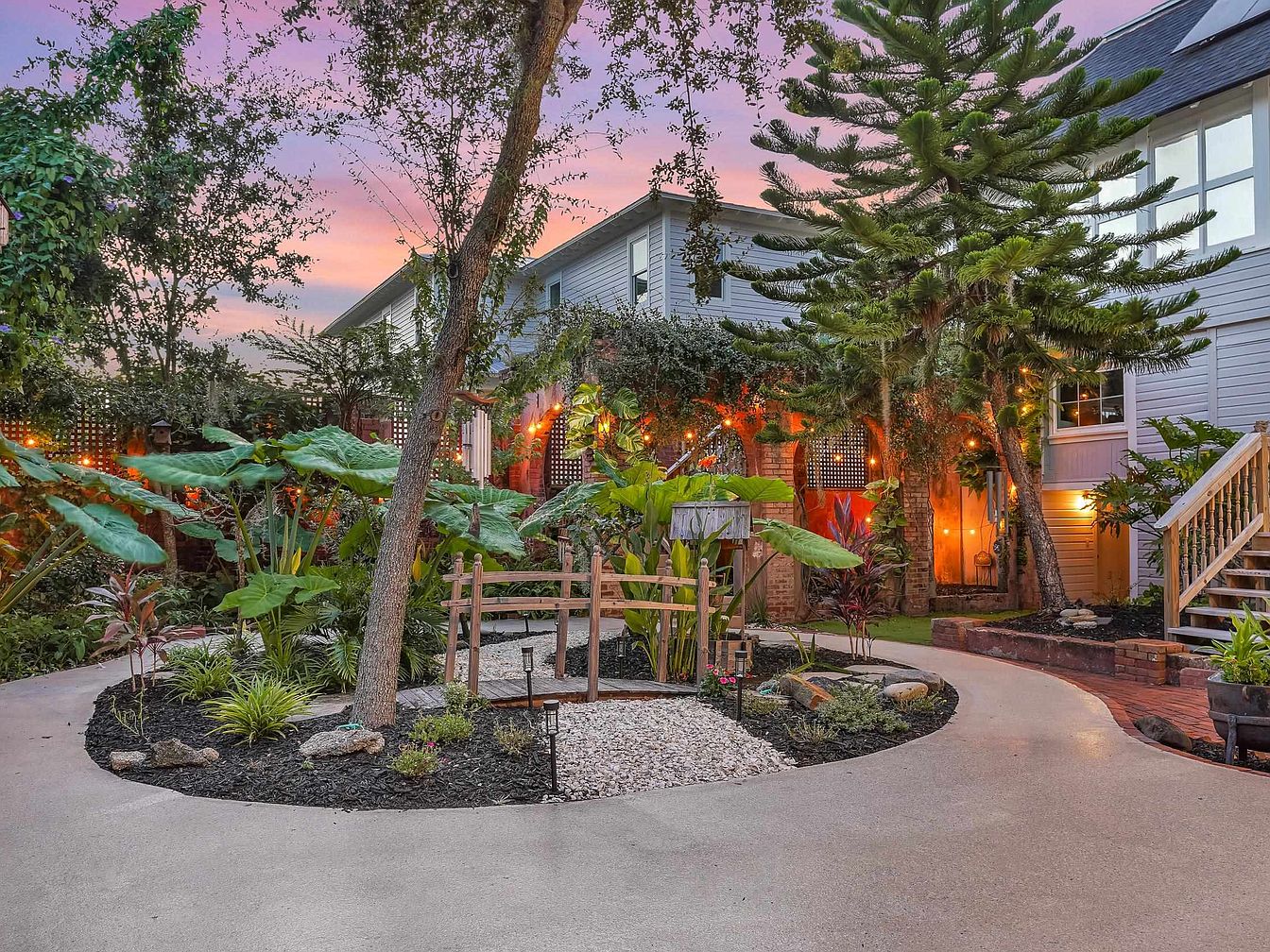 A beautifully landscaped backyard oasis features a winding concrete pathway encircling lush planting beds filled with oversized tropical leaves, ornamental grasses, and vibrant greenery. Mature trees and a variety of plants create privacy and shade, offering an inviting atmosphere for families to gather and play. String lights and strategically placed garden lanterns provide a warm, enchanting glow as dusk settles in. A small wooden bridge adds a whimsical touch, perfect for children’s adventures. The home’s neutral exterior contrasts with the vivid landscaping, and the wraparound porch and stairs offer easy access for outdoor relaxation and entertaining all ages.