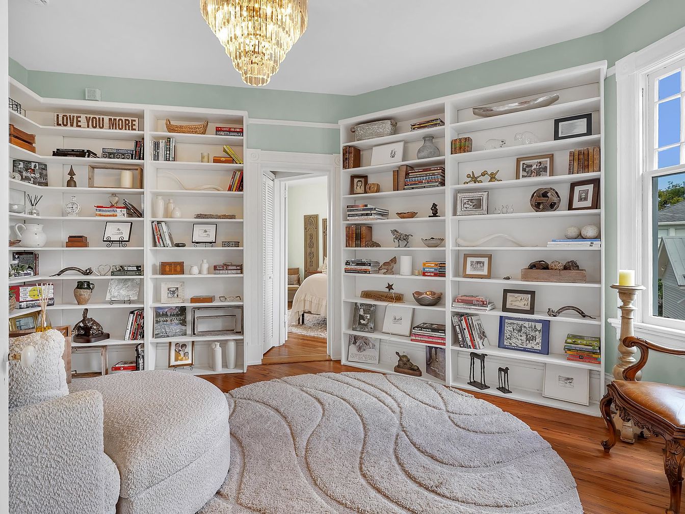 Bright and welcoming, this corner reading room features tall built-in white bookshelves that stretch from floor to ceiling, neatly filled with books, art, keepsakes, and playful family mementos. Sunlight streams through large windows, lighting up the soft sage walls and highlighting the elegant chandelier overhead. A plush textured swivel chair and cozy, sculptural area rug provide a relaxed spot for reading or lounging. Warm wooden floors add a touch of natural charm, while whimsical decor pieces and framed photos create a friendly, personalized space that feels perfect for family time, story sessions, or quiet reflection.