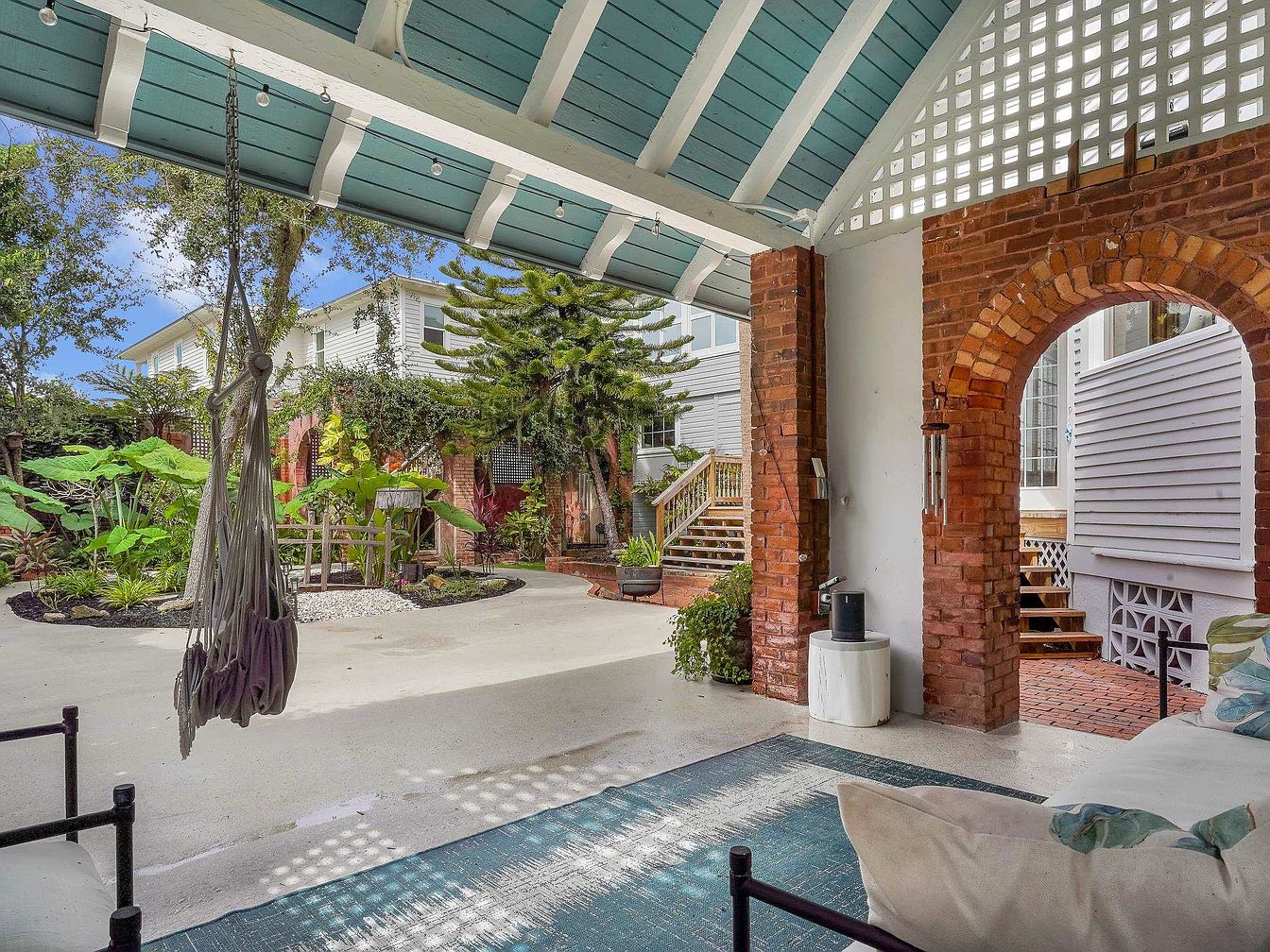 This inviting covered patio blends rustic charm with modern comfort, featuring exposed red brick arches, a cozy hammock swing, and a weathered blue ceiling accented with classic string lights. A comfortable seating area with plush pillows overlooks a serene courtyard filled with lush greenery and ornamental plants, perfect for family gatherings or quiet relaxation. The open layout allows for seamless movement between indoors and out, while the durable flooring is ideal for playful kids. Soft neutral tones are balanced by vibrant plant life, creating a tranquil family-friendly oasis that encourages outdoor living and effortless entertaining.