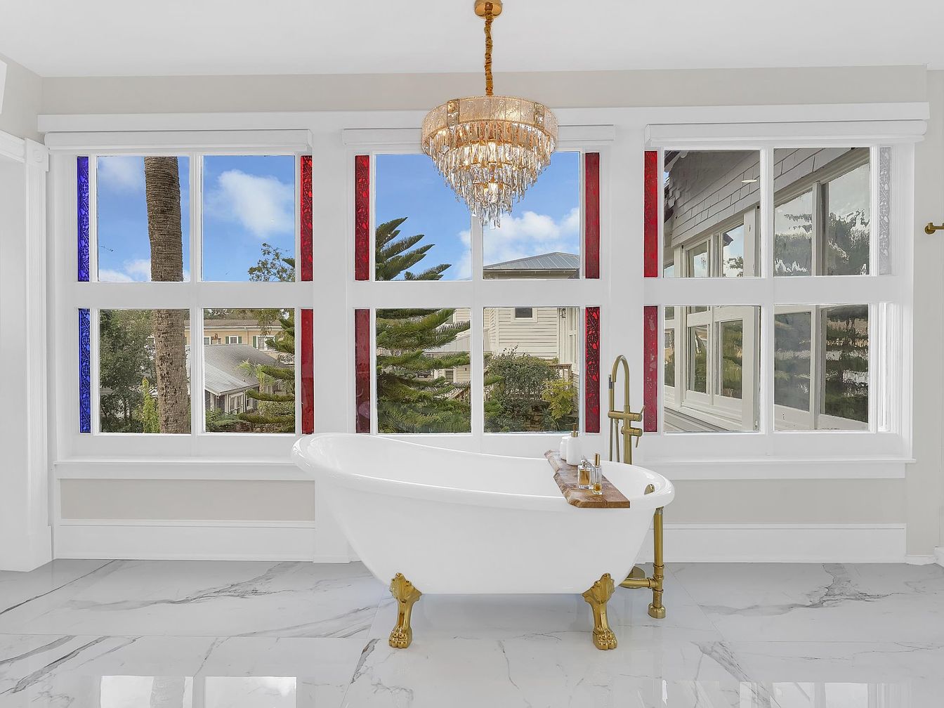 A luxurious bathroom features a freestanding clawfoot soaking tub placed beneath expansive windows, allowing natural light to flood the space. The windows are accented with elegant red and blue glass panels, adding a refined yet playful touch. Gleaming marble floors complement the classic white tub and gold fixtures, enhancing the room’s sense of sophistication. A crystal chandelier adds glamour overhead, creating a serene and indulgent retreat. The clean, neutral palette feels inviting and sophisticated, offering a space where families can unwind. The careful arrangement provides safety and accessibility, making it both functional and family-friendly.