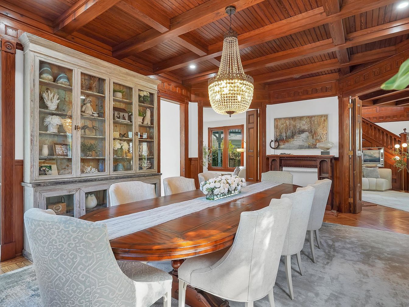 A spacious dining area blends traditional elegance with family-friendly functionality. The rich wooden coffered ceiling and matching paneling give the room timeless warmth, enhanced by a grand crystal chandelier that centers the space. A large, polished wooden dining table comfortably seats at least eight, making this ideal for family gatherings or entertaining guests. Soft gray upholstered chairs add a touch of modern comfort, while the distressed china cabinet introduces a rustic charm with displayed collectibles and decor. Natural light filters in through broad windows, and the open floor plan connects seamlessly to a cozy living area and staircase, encouraging togetherness.