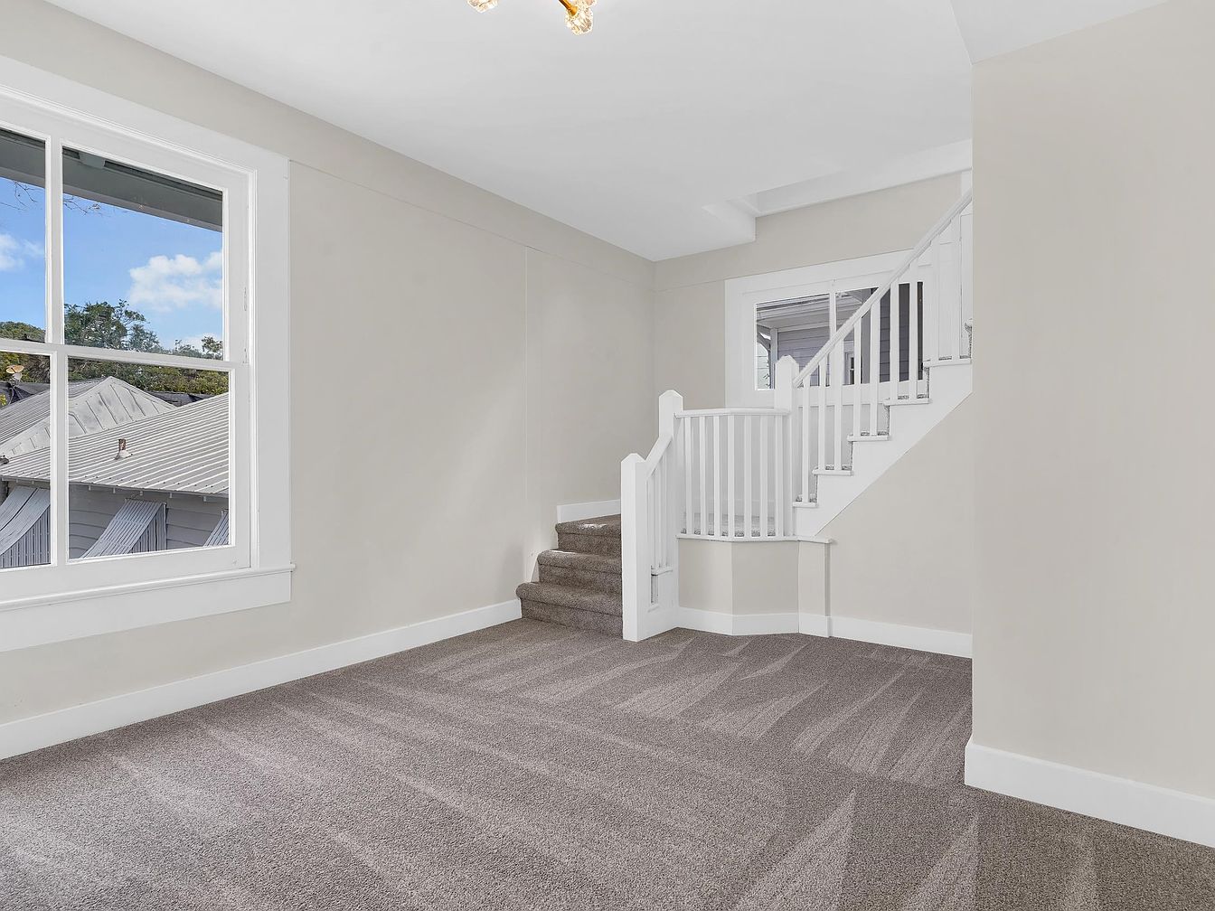 This staircase entryway features welcoming neutral tones, with soft beige walls complemented by plush, light brown carpet that extends throughout the space for maximum comfort and family-friendly appeal. Large windows bring in abundant natural light, brightening the area and offering pleasant outdoor views. The staircase itself is accented with crisp white railings and trim, imparting a fresh, clean aesthetic. The open layout makes it easy to move between levels, while the gentle curve and carpeted steps provide safety for kids and peace of mind for parents. This versatile entryway is perfect for greeting guests or transitioning into the heart of the home.