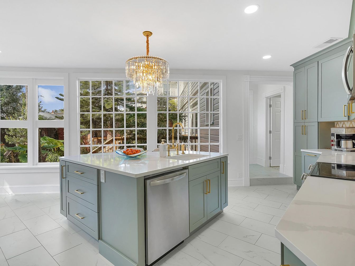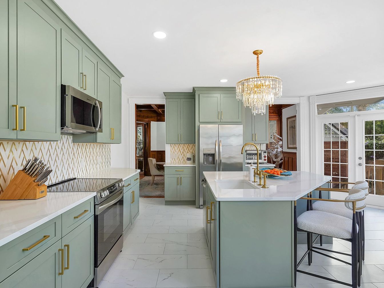 Sleek sage-green cabinets with gold hardware give this kitchen a refined yet fresh feel, complemented by a marble-tiled floor and white quartz countertops. The large central island doubles as a functional workspace and casual dining spot with plush, family-friendly bar stools. Natural light pours in through wide glass doors, brightening the open layout and providing easy access to the outdoors. The backsplash combines geometric gold accents, adding a subtle layer of sophistication. A statement crystal chandelier above the island elevates the room’s aesthetic, while quality appliances and ample storage make this kitchen ideal for family gatherings and everyday cooking.