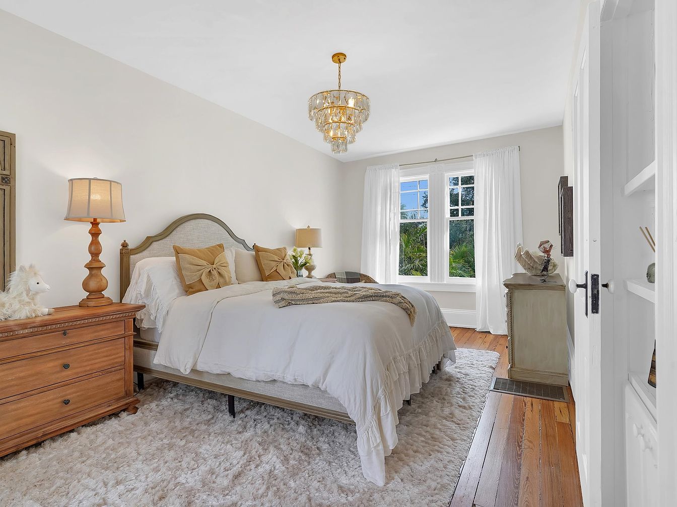 Bright and welcoming, this bedroom radiates comfort with its soft, neutral palette and cozy furnishings. Natural light pours in through tall windows dressed in sheer white curtains, illuminating the room and highlighting the plush, textured rug underfoot. The classic wooden bed frame, dressed in fresh white bedding with charming bow-accented pillows, anchors the space. Family-friendly touches include a soft toy on the dresser and plenty of floor space for play. Warm wood tones from the nightstand and antique-inspired furniture mix with elegant details like a chandelier, creating a harmonious balance of sophistication and homely warmth.