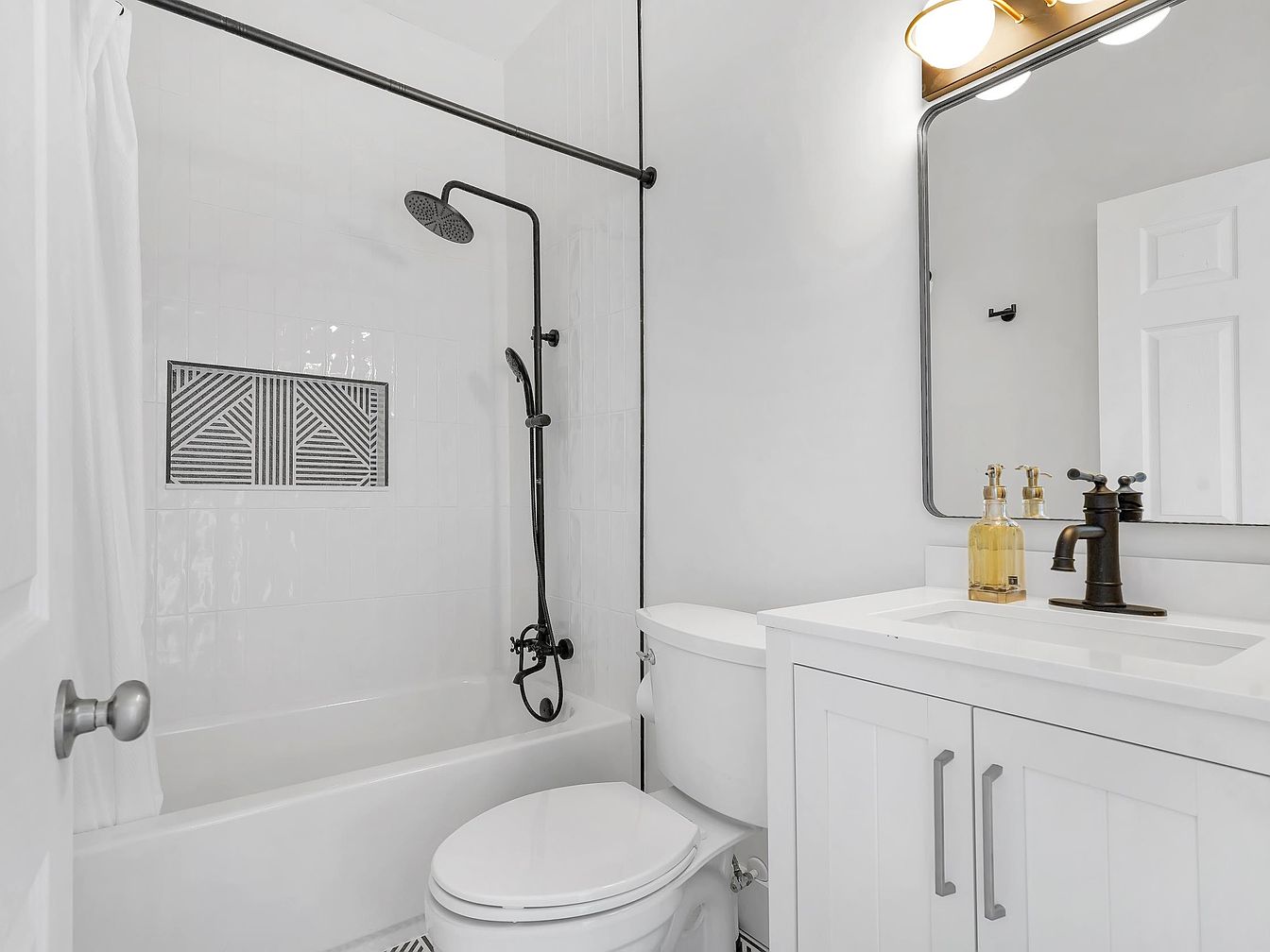 A bright, inviting bathroom features crisp white tiles and an elegant walk-in shower with a matte black rain showerhead and matching hardware. The built-in geometric tile accent in the shower adds a touch of modern artistry. The vanity is topped with a sleek white countertop and fitted with contrasting black faucet fixtures, complemented by gold-toned soap dispensers for a touch of warmth. Family-friendly elements are abundant, from the full bathtub perfect for children to the easy-to-clean surfaces and accessible layout. Soft lighting above the large mirror enhances the serene, clean-lined atmosphere, creating a fresh spa-like retreat.