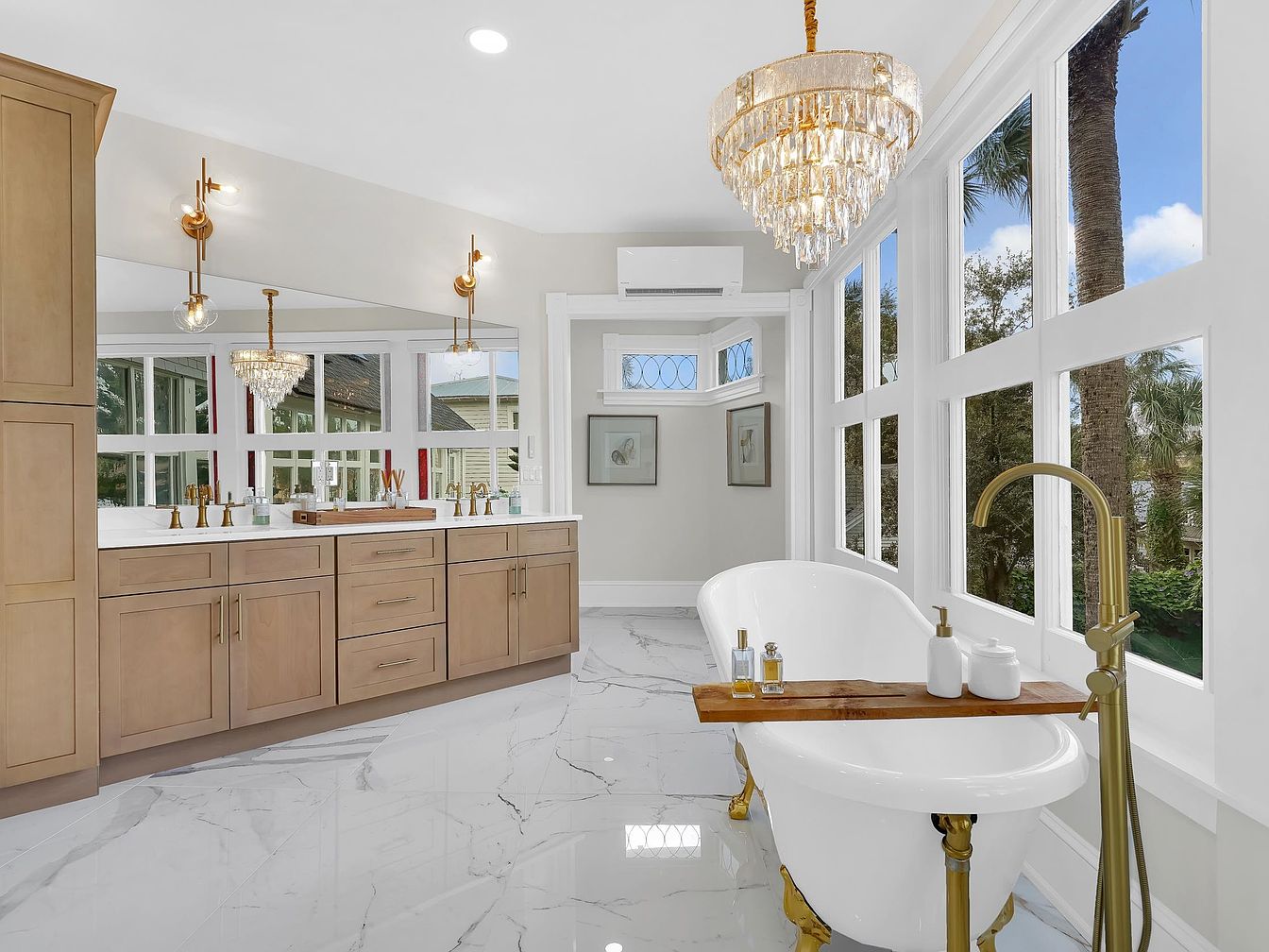 Flooded with natural light, this spacious bathroom features floor-to-ceiling windows offering tranquil views of lush greenery. The elegant freestanding soaking tub with gold fixtures nestles in the corner beneath a sparkling chandelier, creating a spa-like environment. Warm wood cabinetry provides ample storage and counter space, complemented by brass hardware and twin mirrors for convenience. Polished marble-look floors and soft cream walls enhance the serene ambiance. Family-friendly touches include double sinks for shared use and open floor space for safety, making it both practical and luxurious. The overall layout prioritizes relaxation and everyday functionality, perfect for a modern family home.
