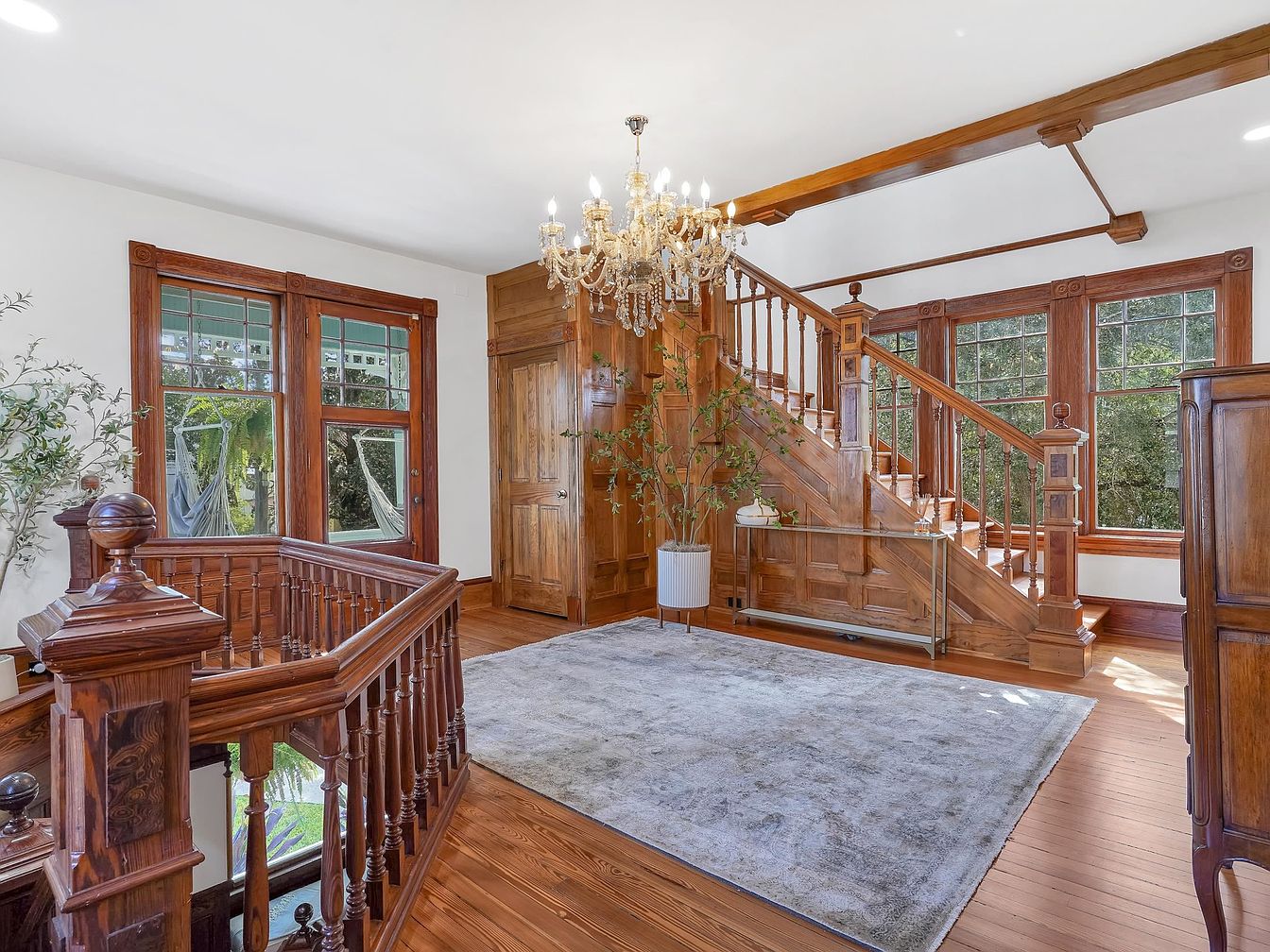 Warm natural woodwork highlights this spacious staircase landing, complete with finely crafted banisters and large picture windows that bathe the space in sunlight. The expansive landing provides an open area ideal for gathering, playtime, or family reading. A grand, sparkling chandelier adds a touch of classic elegance, complementing the intricate moldings and detailed paneling. The neutral area rug softens the hardwood floors, creating a cozy atmosphere, while potted greenery brings a fresh, welcoming touch. Soft cream walls balance the richness of the wood for a harmonious and timeless look, making this a beautiful family-friendly transition space.