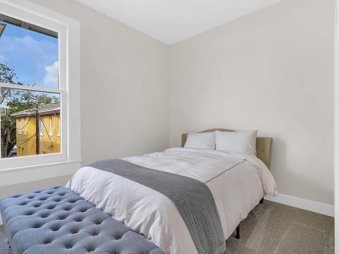 A peaceful bedroom retreat featuring a plush, neutral-colored bed dressed in crisp white linens and a textured gray throw. The soft beige walls lend a calming atmosphere, complemented by the taupe upholstered headboard. A tufted blue bench at the foot of the bed provides both seating and visual interest, ideal for family needs like reading or tying shoes. The large window welcomes abundant natural light, brightening the space and offering serene outdoor views. Textured carpeting underfoot enhances comfort, making the room inviting for children and adults alike. Clean trim and uncluttered design highlight modern simplicity and timeless comfort.