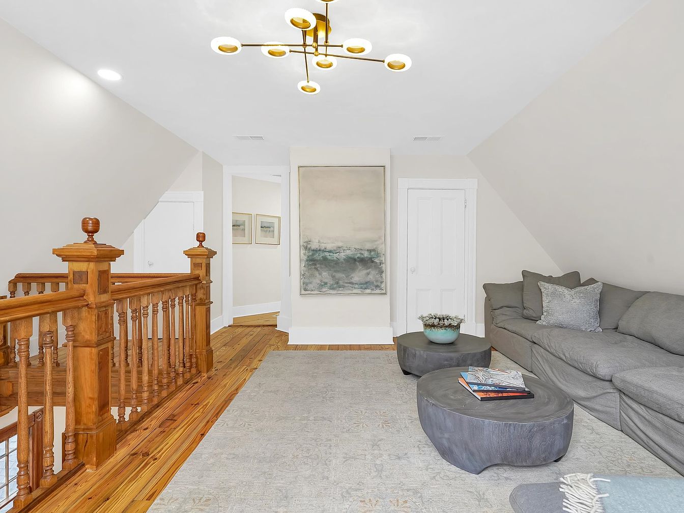 This airy upstairs lounge nook combines comfort and elegance, featuring a cozy gray sectional perfect for family gatherings or relaxing with a book. The soft neutral palette, highlighted by crisp white walls and warm wood flooring, creates a sense of openness and tranquility. Stylish touches include contemporary art, a modern chandelier, and matching round coffee tables with artful arrangements. The charming wood banister and trim add character while ensuring safety for children. Thoughtfully arranged, this nook provides both seating and space for play, making it ideal for family living and informal entertaining.