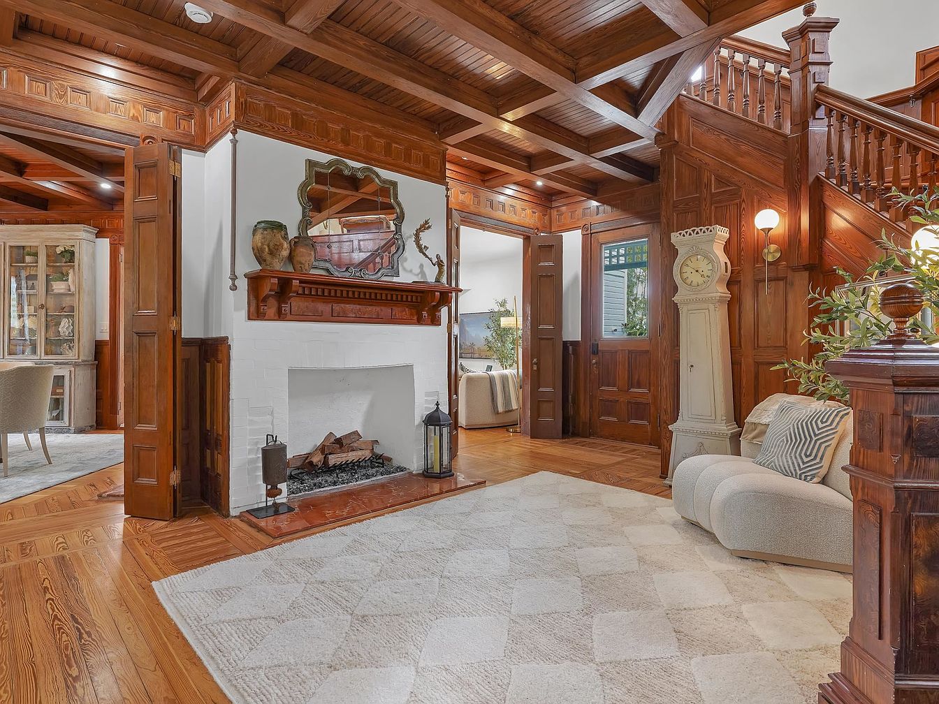 Rich wood paneling and coffered ceilings set an inviting tone in this spacious foyer, filled with natural light from large windows and transoms around the front door. An elegant staircase anchors the space, its intricate banisters providing both charm and safety, making it ideal for families with children. The plush, neutral area rug softens the room and adds warmth, while a cozy accent chair and soft throw create a welcoming nook for guests. Architectural details such as the ornate grandfather clock and decorative trim enhance the home’s timeless character, offering a perfect blend of comfort and classic American style.