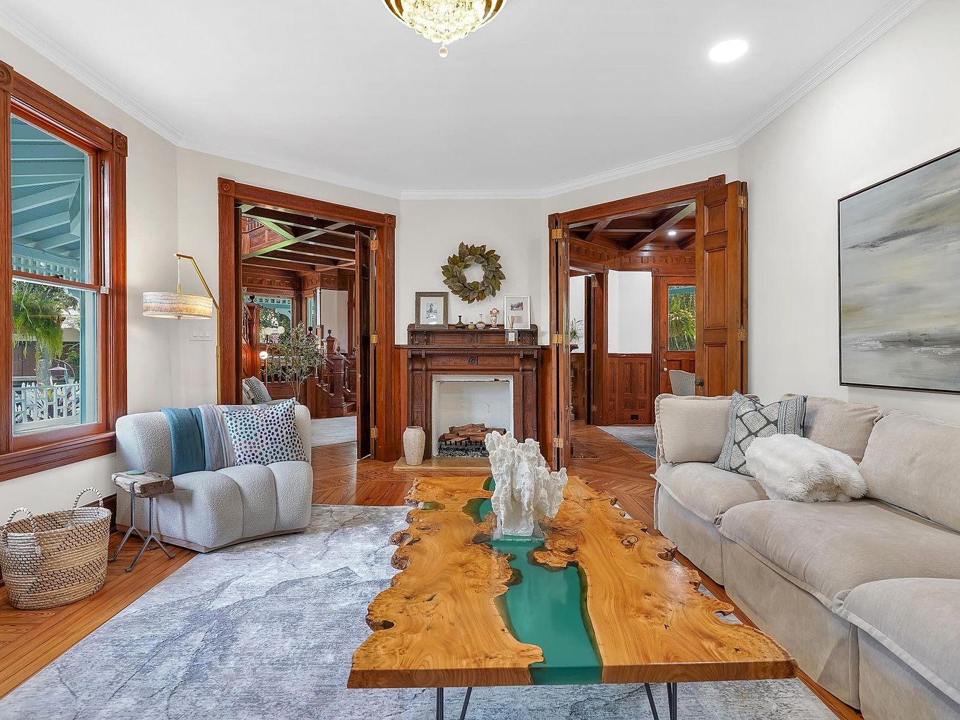 Warm wood trim frames the windows, doors, and classic fireplace, adding character to this inviting living room. A statement live-edge coffee table with vibrant resin accents sits atop a soft, patterned area rug, encouraging family gatherings and conversation. The plush beige sectional, complemented by cozy throws and textured cushions, provides ample seating for all. A modern, rounded accent chair and floor lamp create a reading nook near the window, while woven baskets offer family-friendly storage. Neutral wall tones and contemporary art balance the historic charm of wooden architectural details, resulting in a harmonious, welcoming space ideal for relaxing or entertaining.