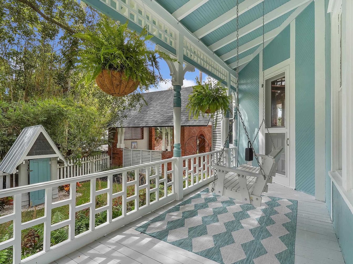 This welcoming front porch boasts classic Southern charm with its cheerful pastel blue and white color palette, creating a relaxing and inviting atmosphere. A cozy white porch swing hangs from the angled ceiling, perfect for enjoying quiet moments or family conversation. The porch is accented with intricate railing details and a geometric-patterned rug that adds a playful, contemporary touch. Hanging ferns provide a splash of greenery, contributing to a fresh, natural vibe. Overlooking a fenced garden and a quaint playhouse, the space offers child-friendly features and a sense of privacy, making it ideal for families and gatherings alike.